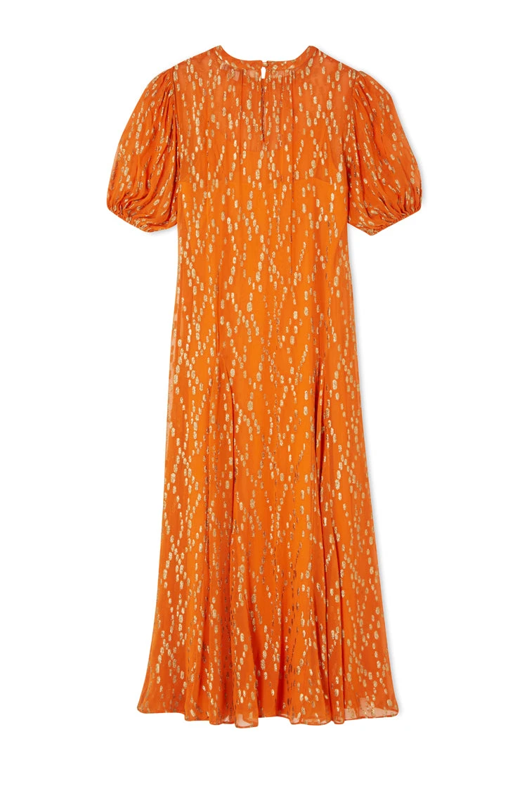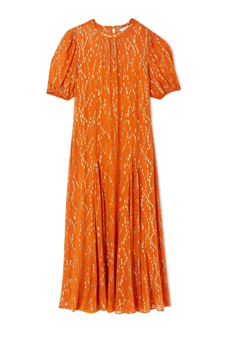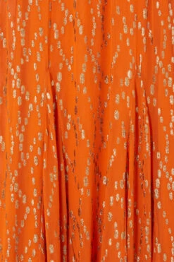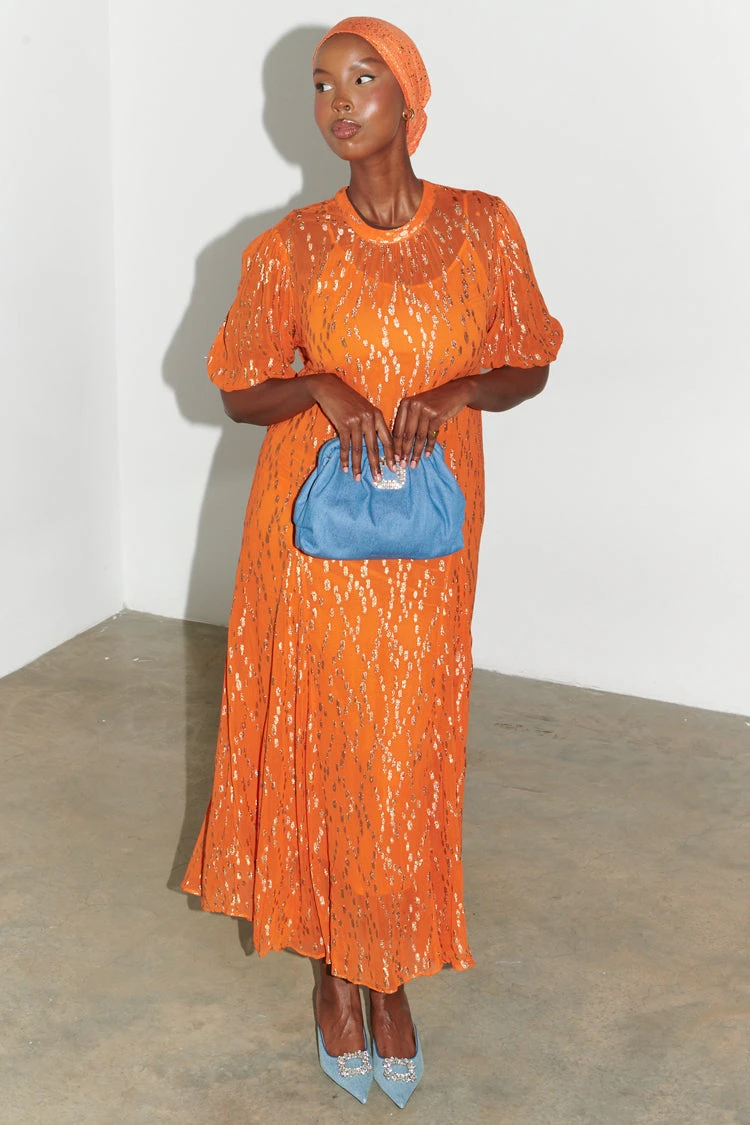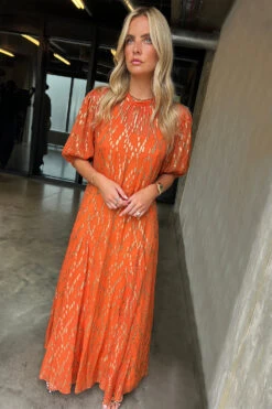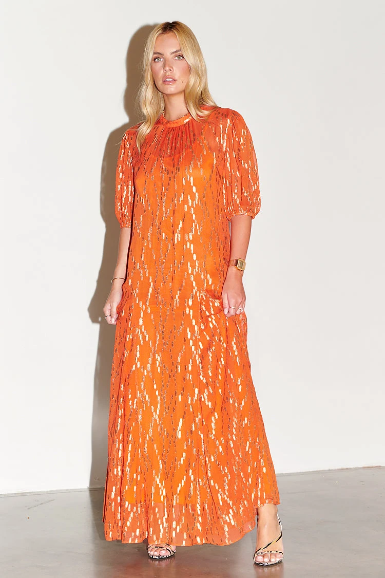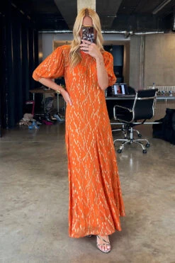 A gorgeously vibrant smock style dress, with puffball sleeves, and a full skirt. It’s bright orange hue pairs so well with the gold threads that are woven through it in a diamond-looking formation. A free fitting silhouette ensures comfortability and adds a bohemian edge – amazing for every occasion, from vacations to Christmas parties.