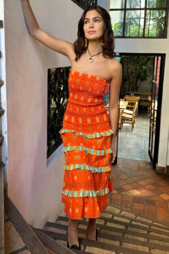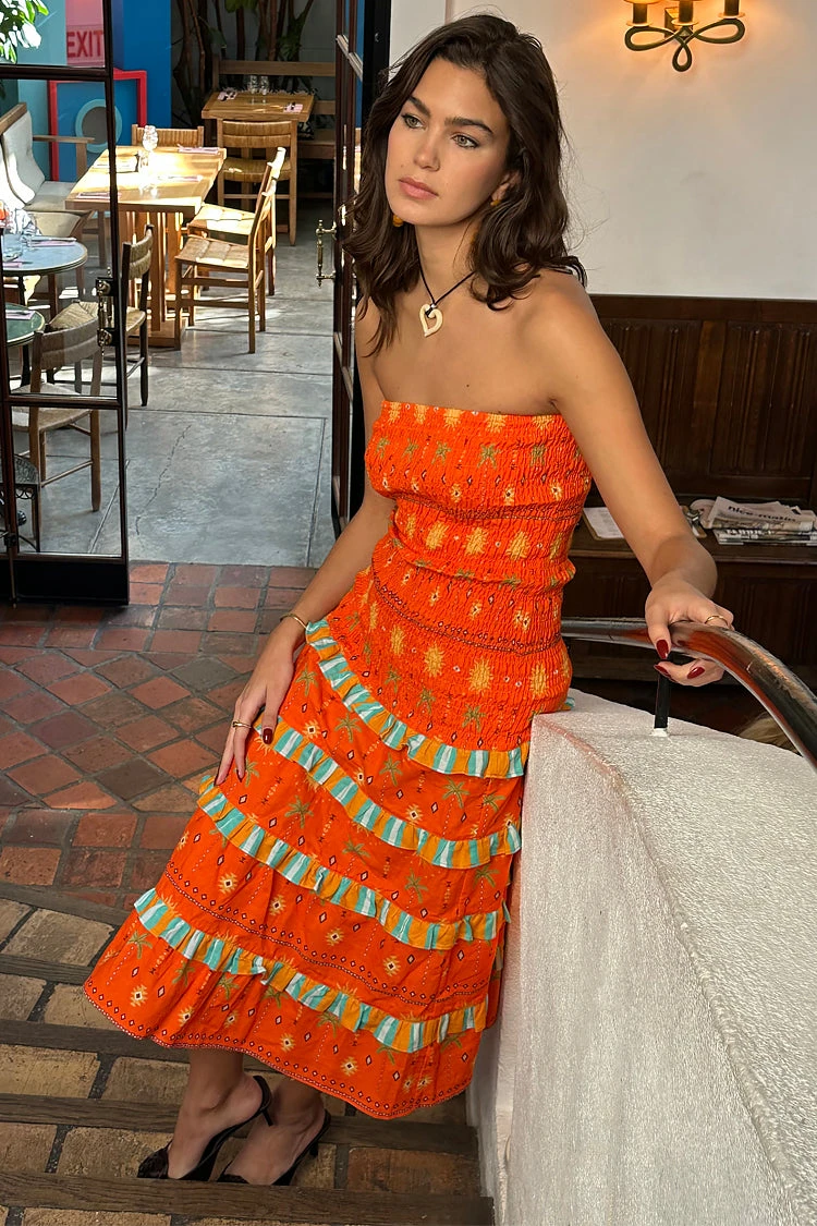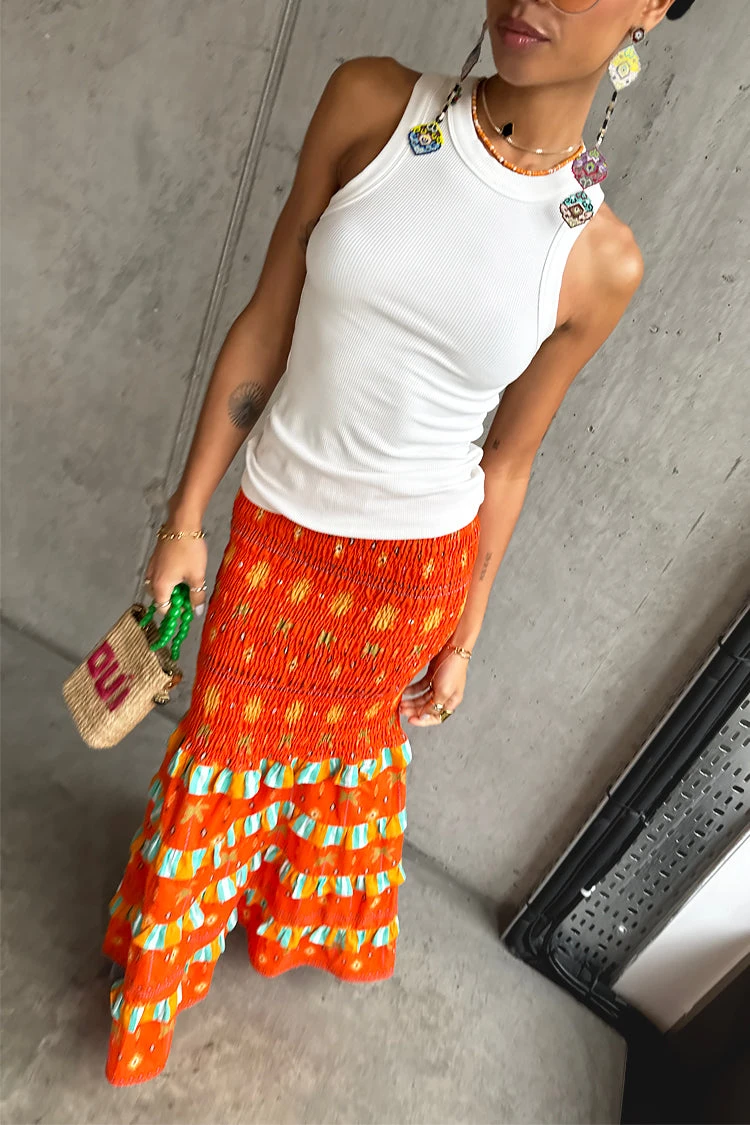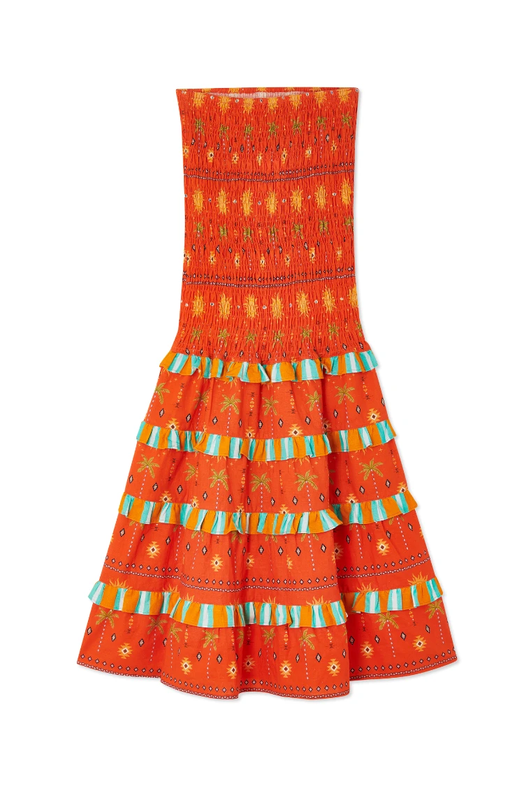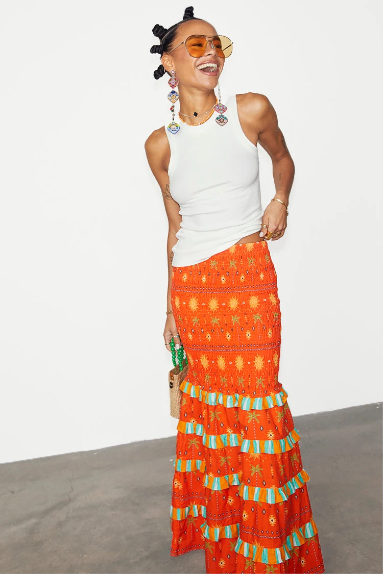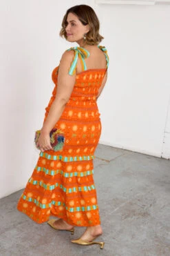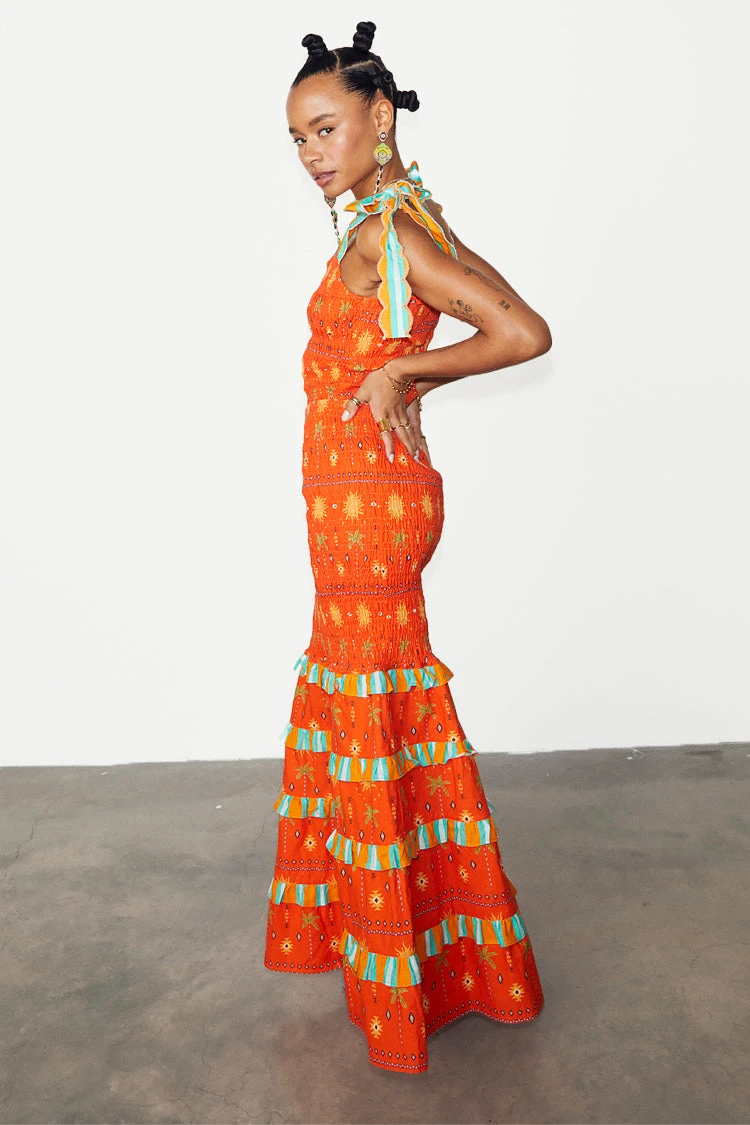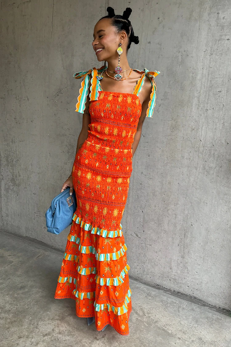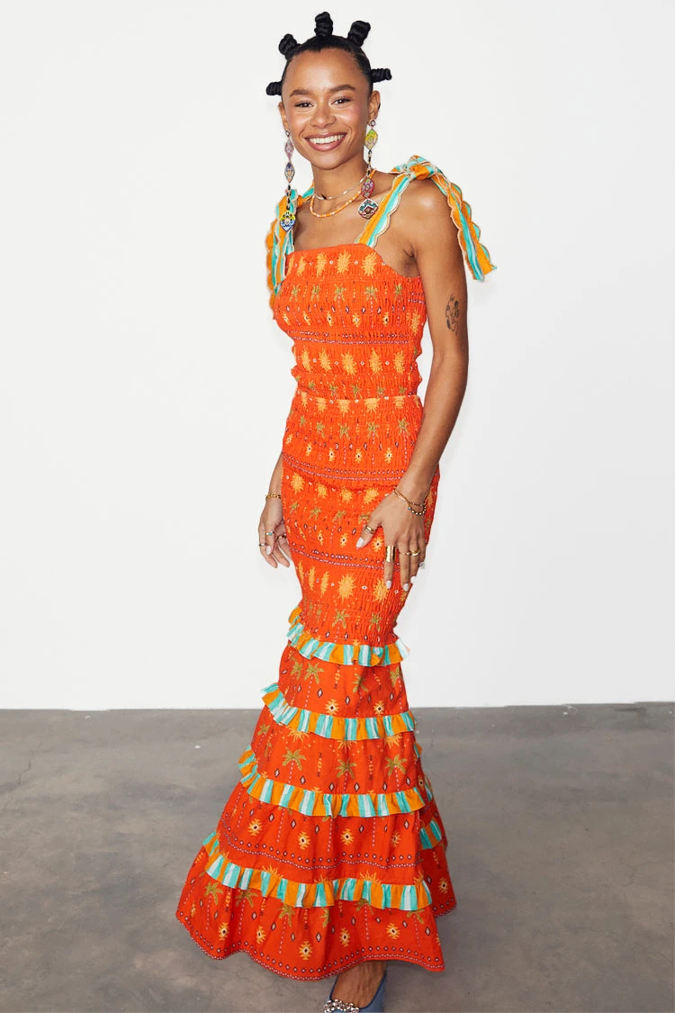 A shirred, fabric which then flares at the thigh to create a beautiful trumpet silhouette that comfortably hugs your curves and and defines the waist without restricting movement. The tiered, pleated frills also and an air of delicacy and femininity. Paired with a kitten heel and a clutch this co-ord is a must have for your summer wardrobe!