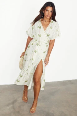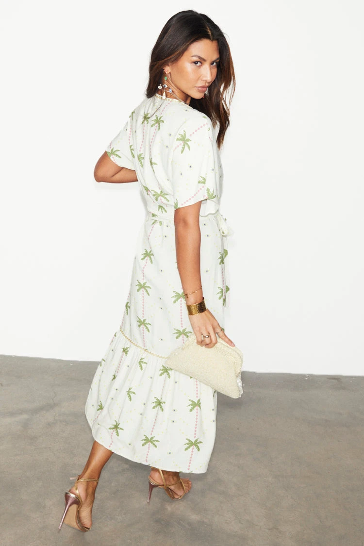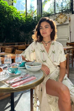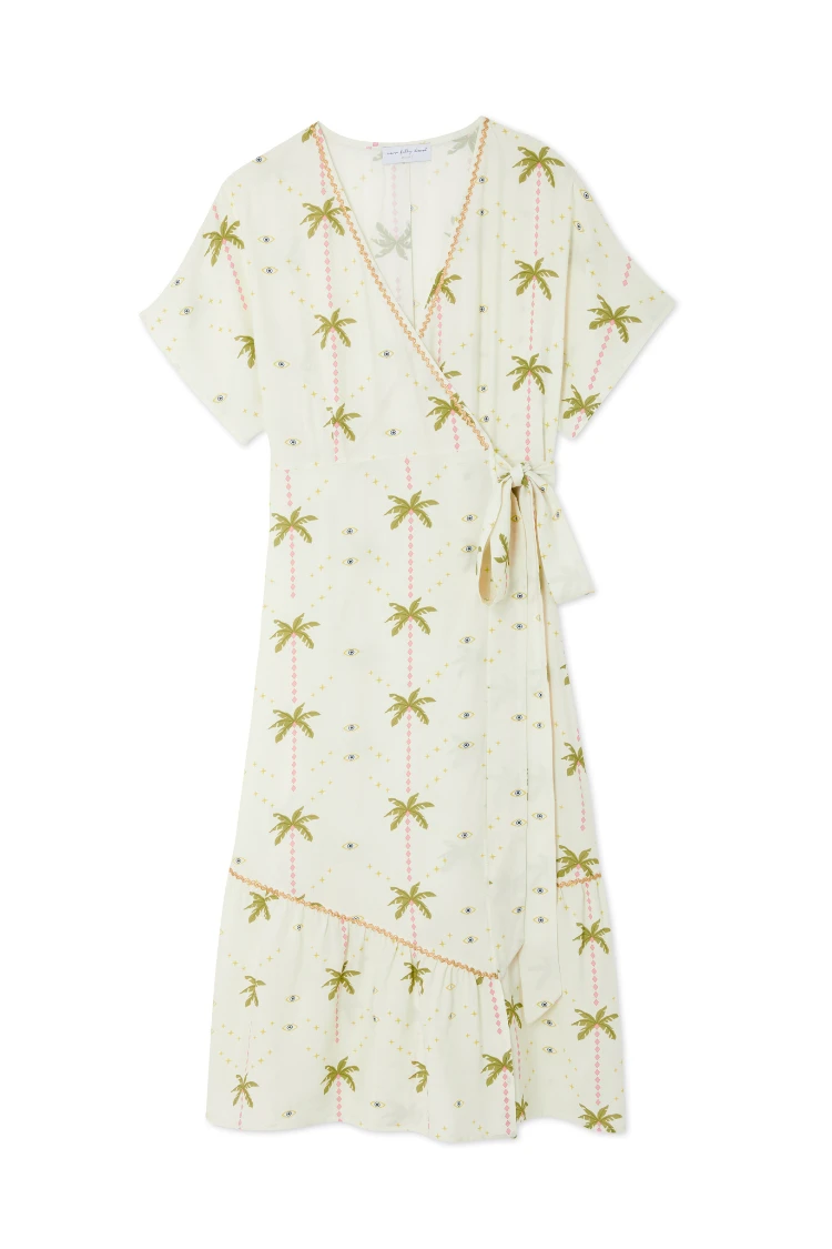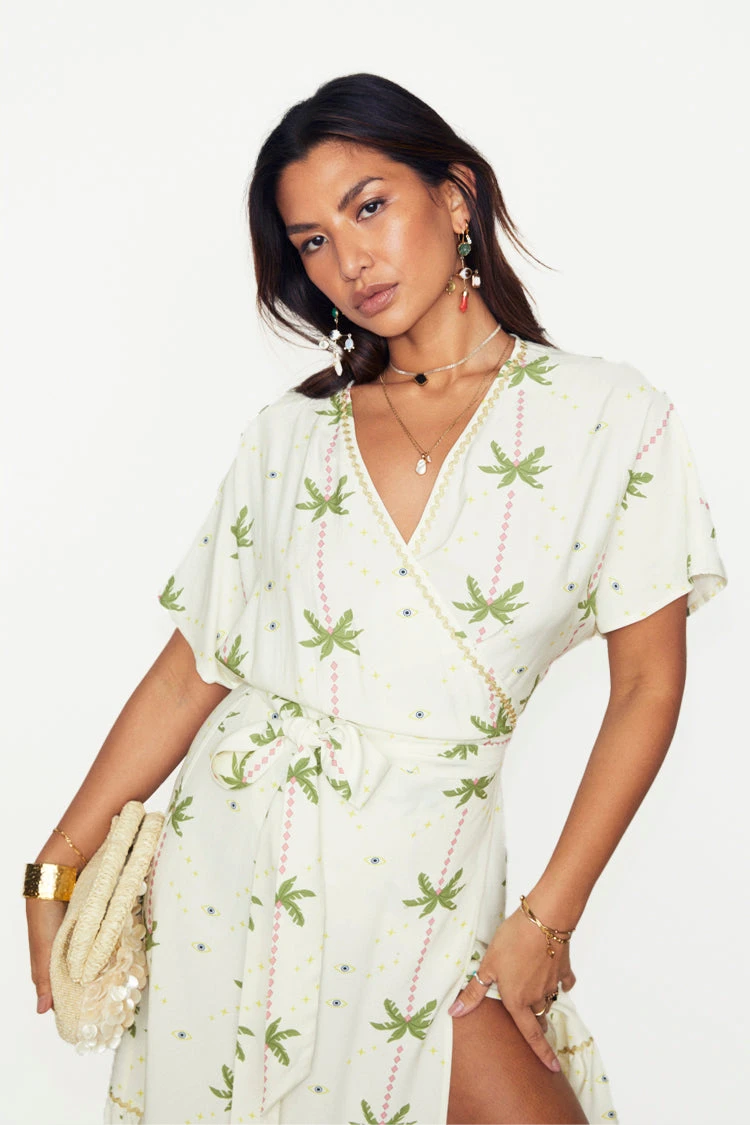 A print that transports you straight to the Santorini beaches. The lightweight fabric and flowy silhouette makes it so dreamy for vacation dressing, and perfect for summer weddings. As always there’s definition from the wrap waist and so much versatility with styling and coverage.