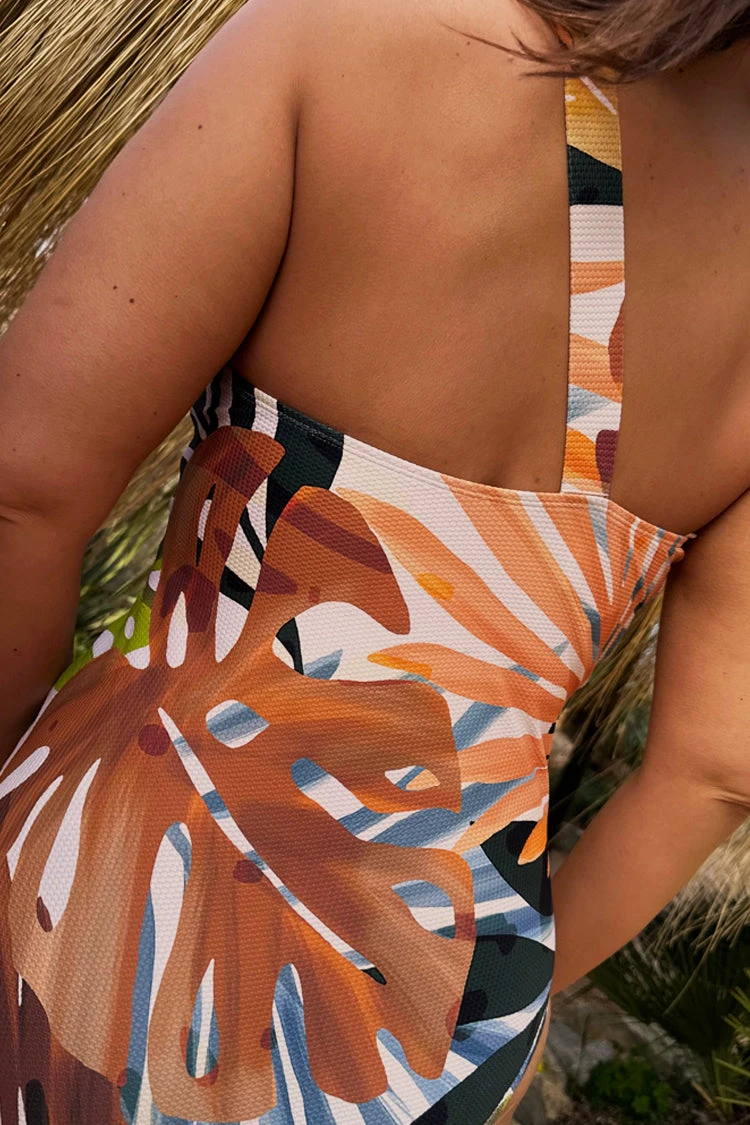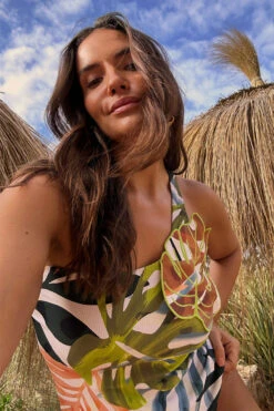With an asymmetrical one strap style, and a palm leaf that sits over the shoulder. It’s covered in a palm print with the most gorgeous palette, and was heavily inspired by our team’s time spent in Sicily and Marbella.