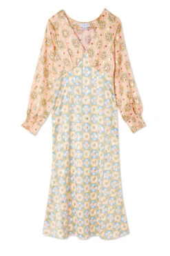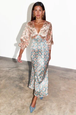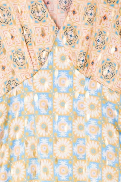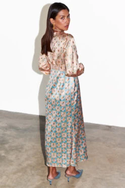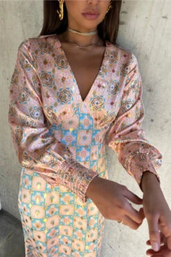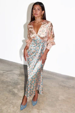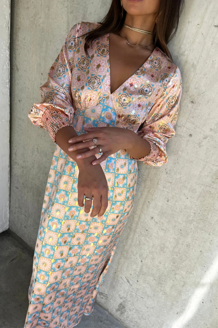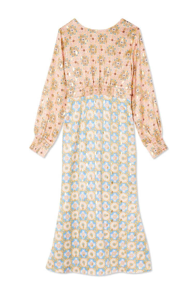 An unlikely influence was the driving force behind this print, originating from decorative tiles contrasting against the concrete jungle itself, New York City. Creating an illusion-like affect where at first glance you see a beautiful pattern but take a second look and you will see hidden details. If you look closely, you can find palms, cocktails, suns and hearts within the geo. Made from a heavy gloss viscose that really drapes over the frame and skims the figure.