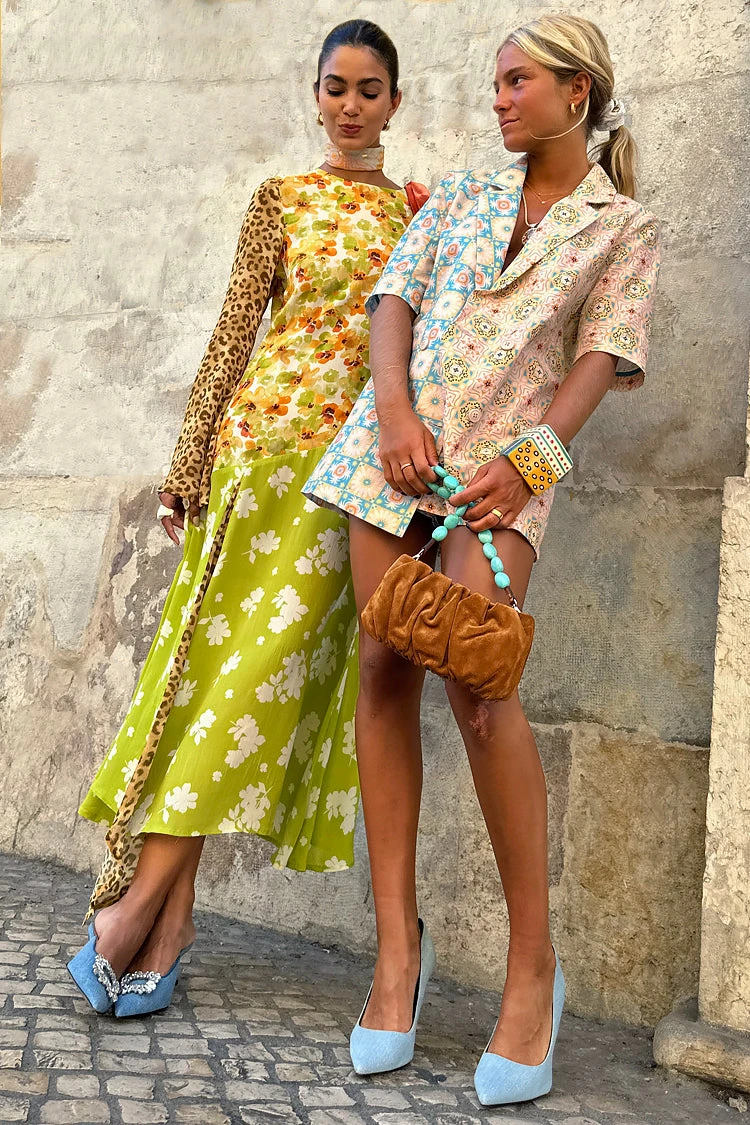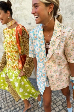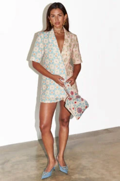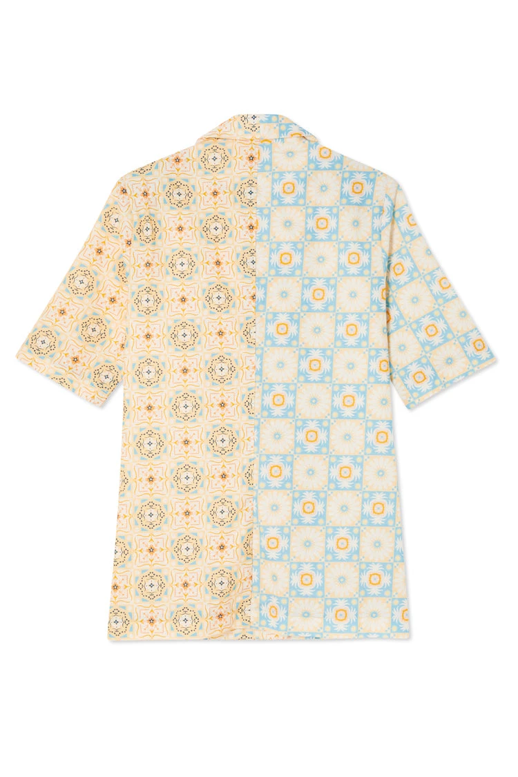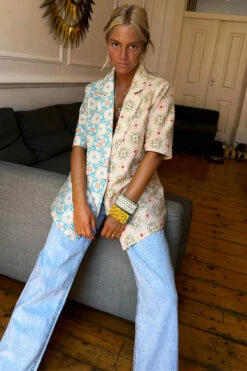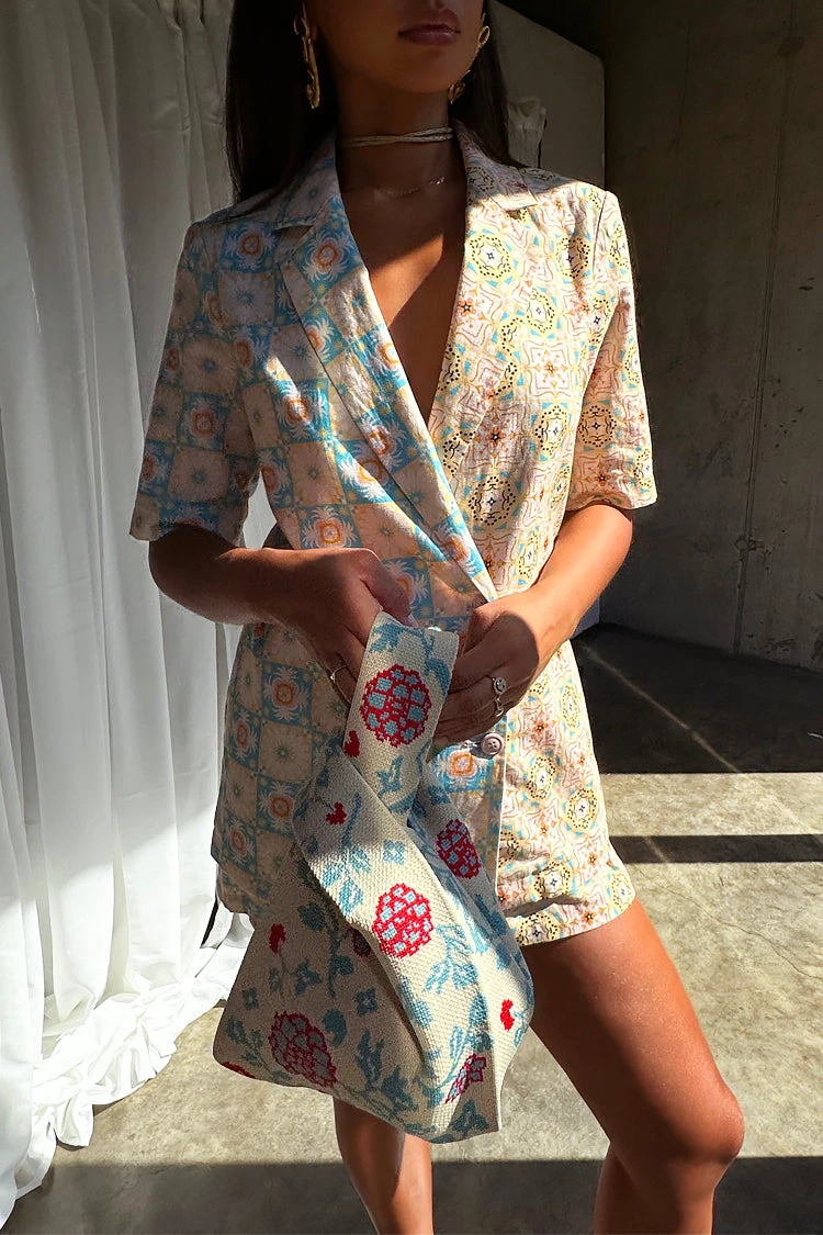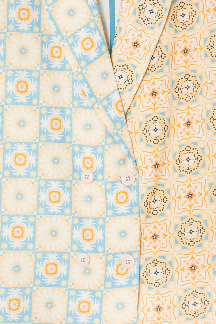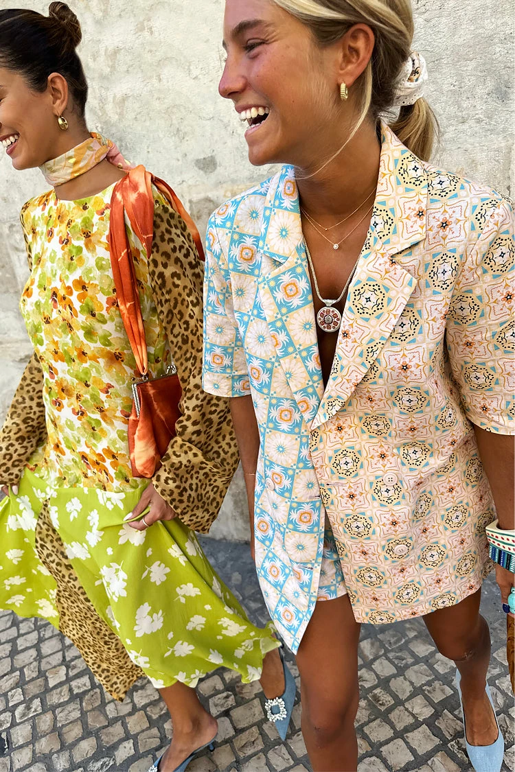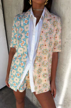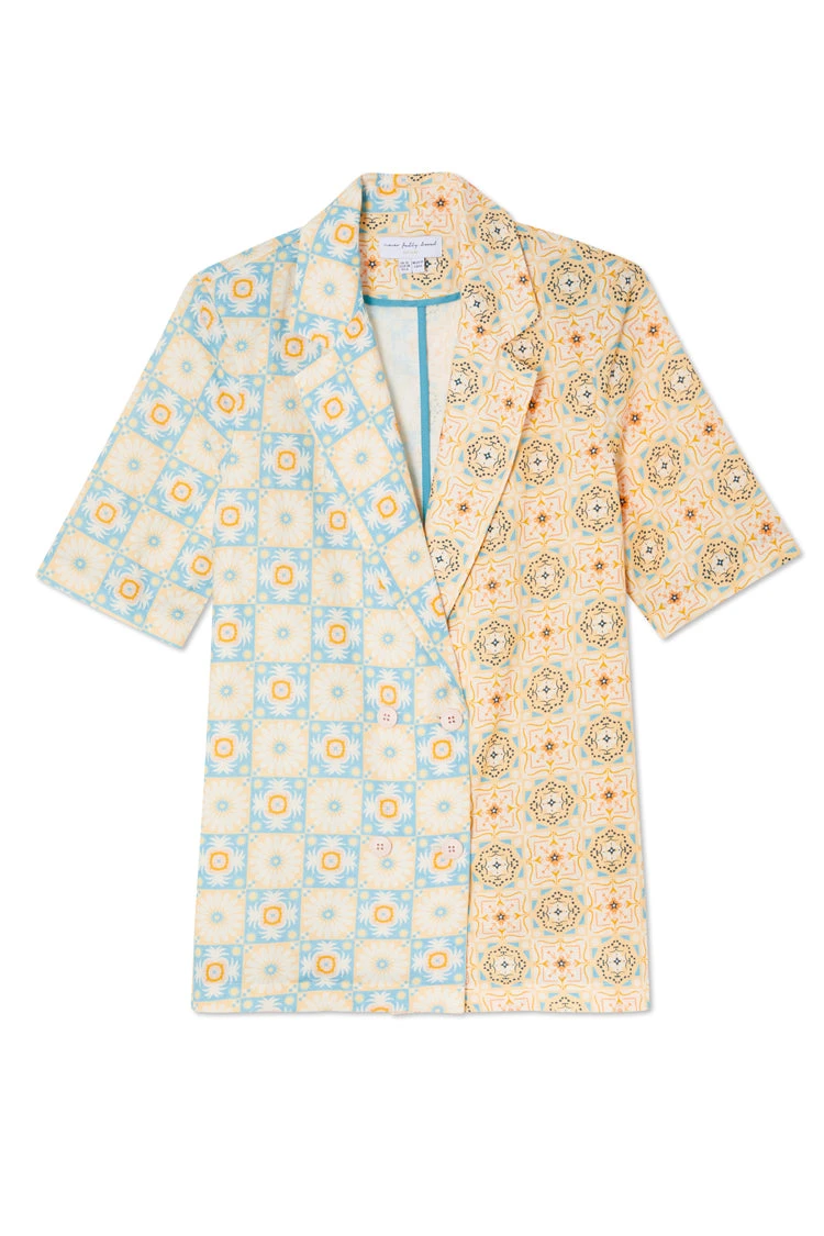 A boxy short sleeve blazer made from a breezy cotton linen, so you can still take that suiting look through to spring summer. Creating an illusion-like affect where at first glance you see a beautiful pattern, but take a second look and you will see hidden details. If you look closely, you can find palms, cocktails, suns and hearts within the geo.