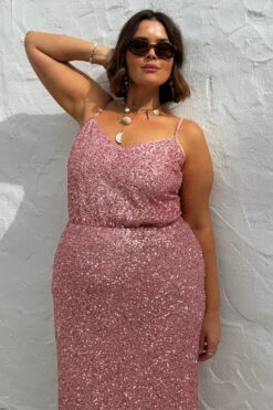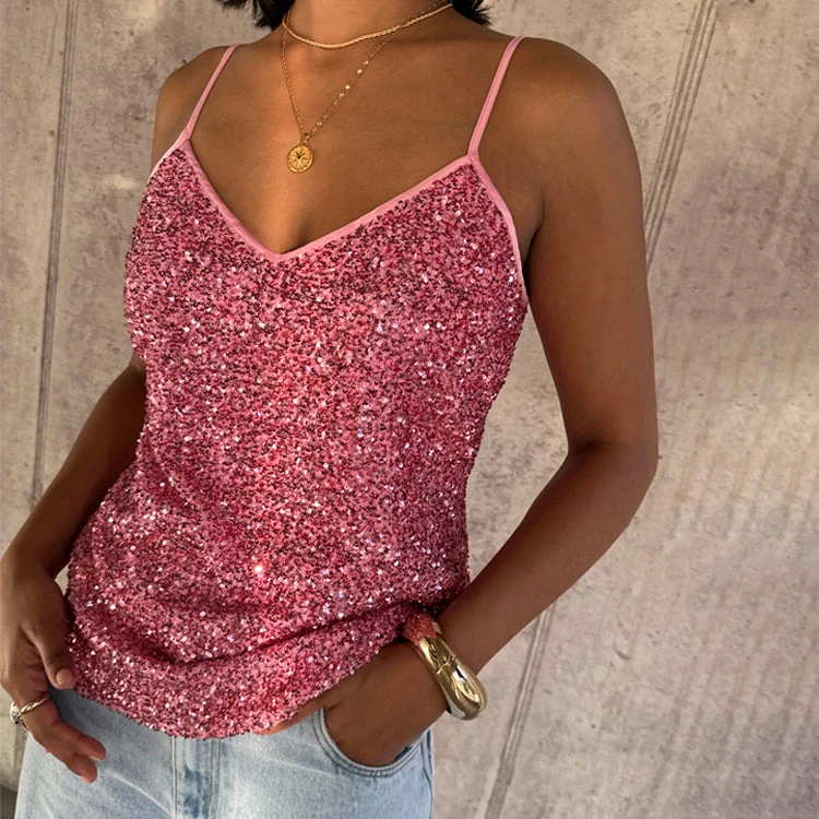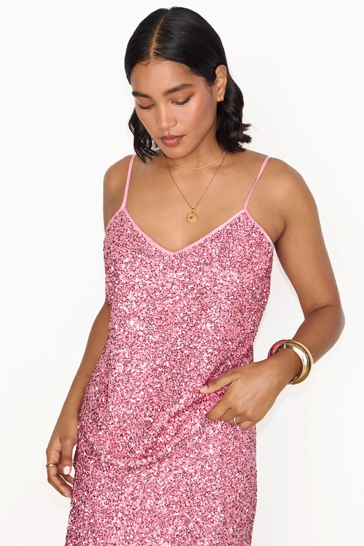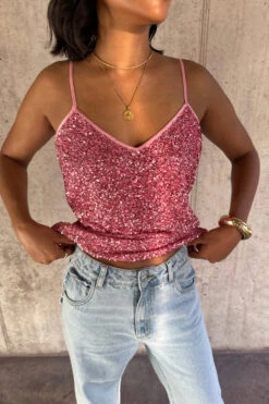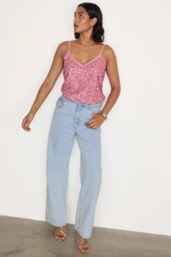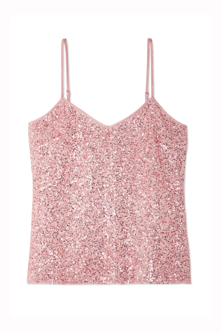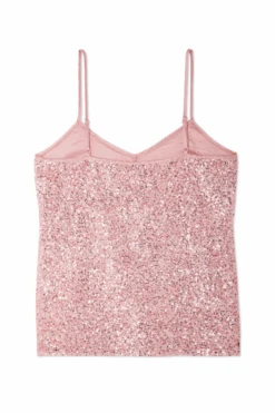 From festival season to bridesmaid chic, sparkle is always a good option. Lathered in beautiful pink sequins that catch the sunlight like a disco ball. A classic cami shape with a subtle V neck and adjustable straps.