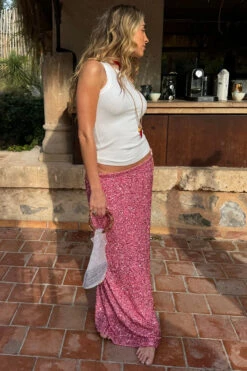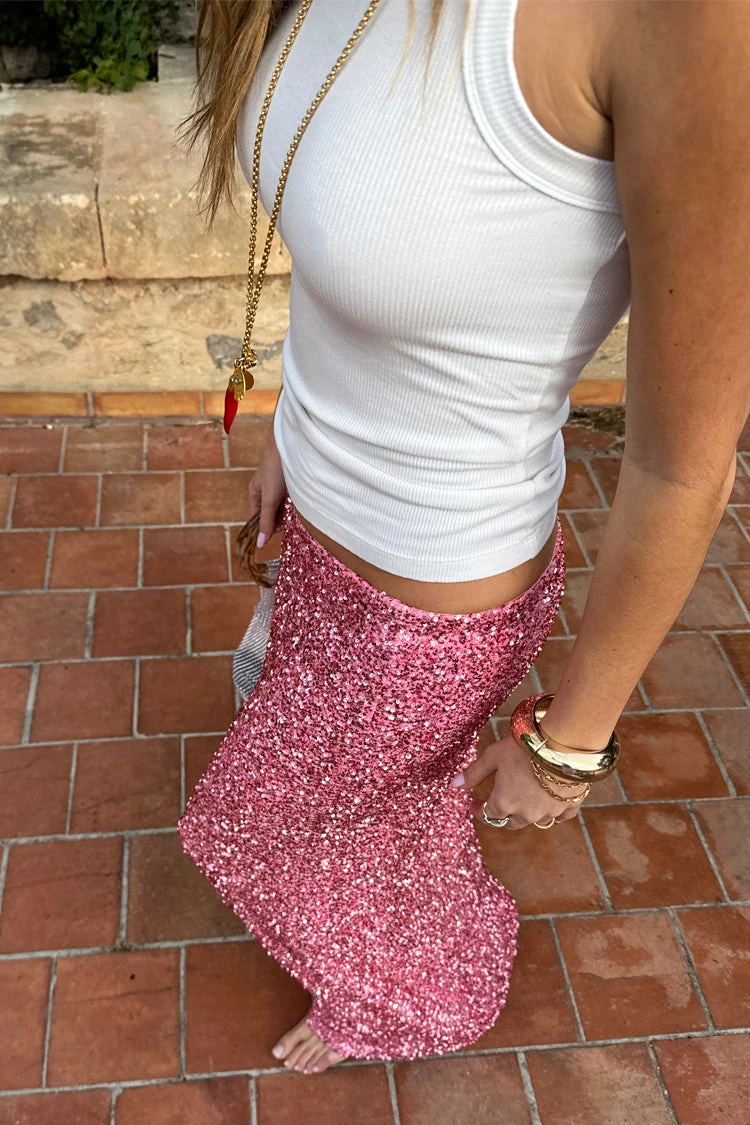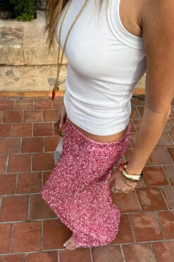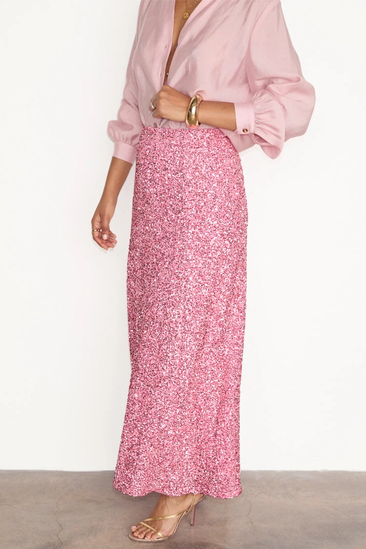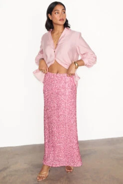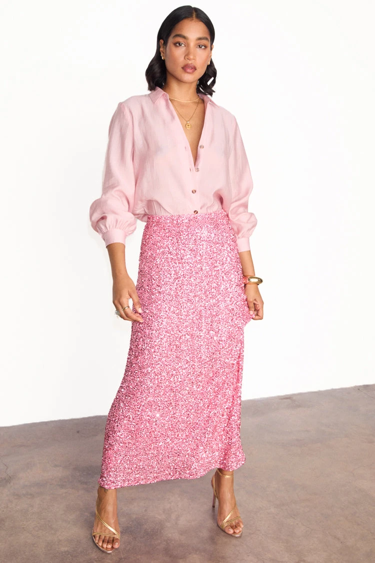 Crafted from hundreds of sequins that are highlighted by the sunshine, and with it being a classic baby pink (so in right now and always), it’ll take you from festivities through to festivals. With the silhouette of a slip skirt, lined with a heavy gloss satin to drape the figure flawlessly.