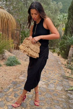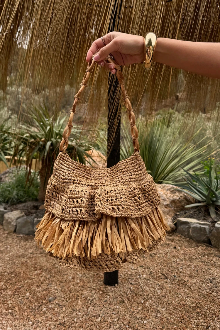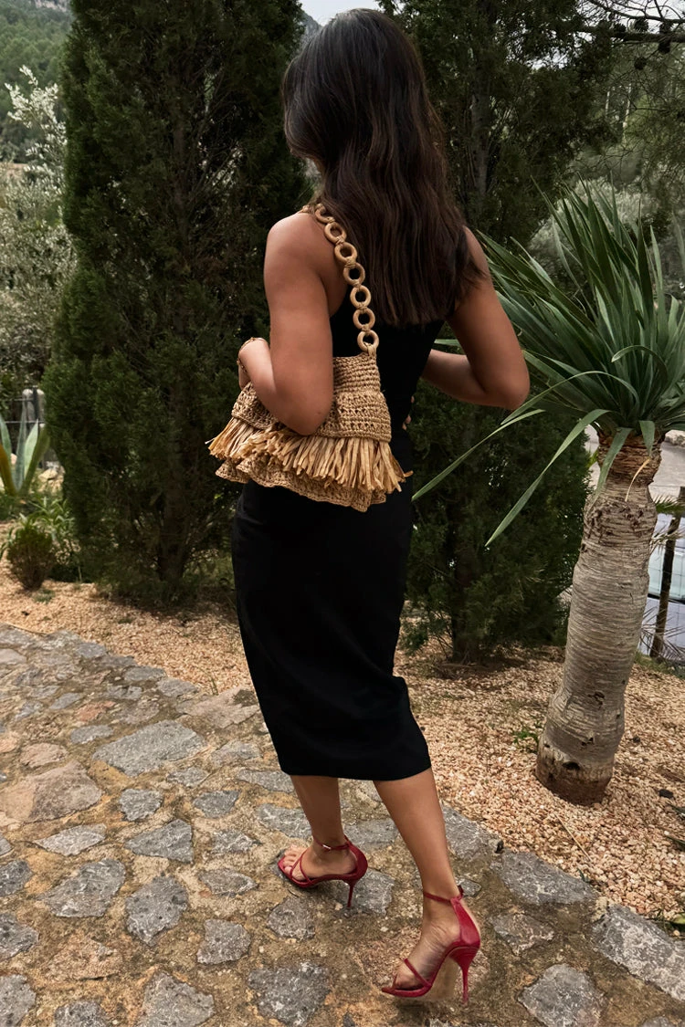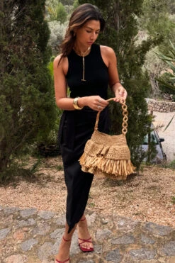 Fully woven bag with tassel detailing and a wooden loop shoulder strap, adding an extra touch of texture. Added to one of our maxi dresses or paired with a co-ord, it is a great beach day accessory. Also available in Black.
