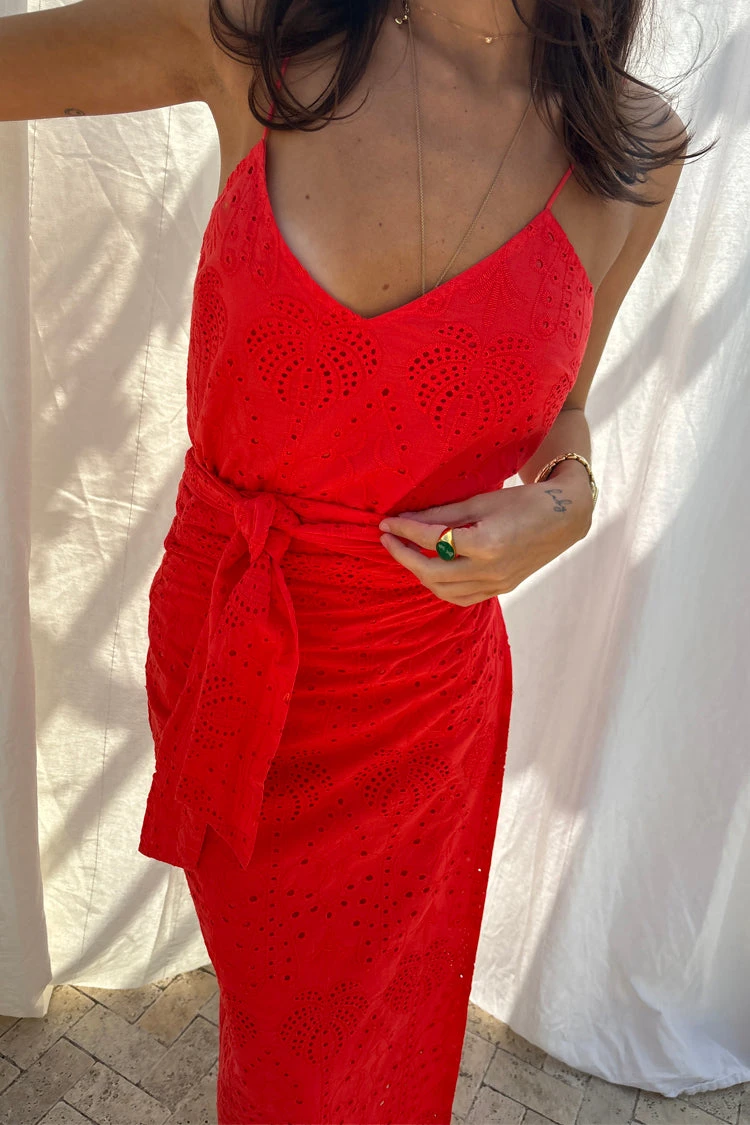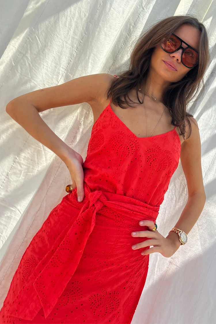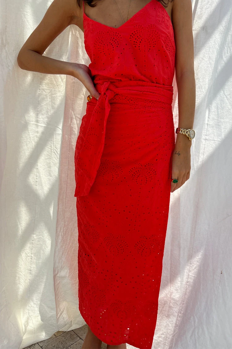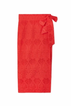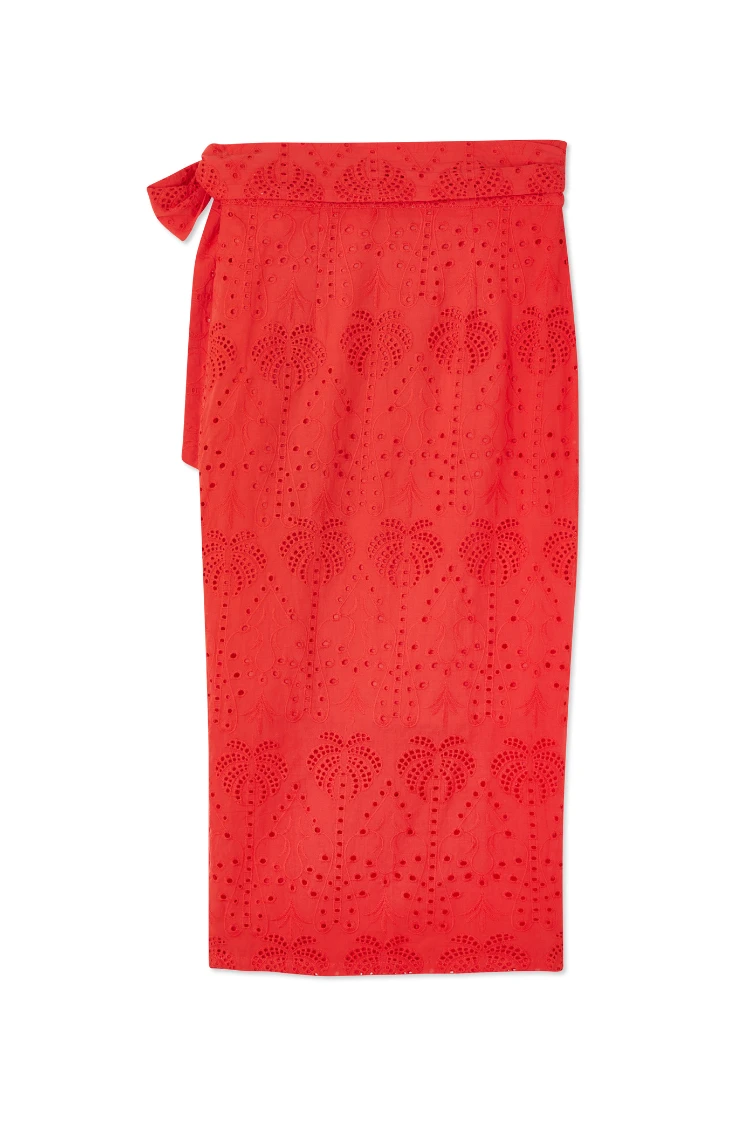 This broderie design was curated by our in-house design team, inspired by their trips to the spanish islands. The beloved palms are a recurring theme throughout our collections because they feel like balmy beach evenings and sunshine on the skin. The Jaspre skirt has an adjustable wrap waist and can be tied in a variation of styles.