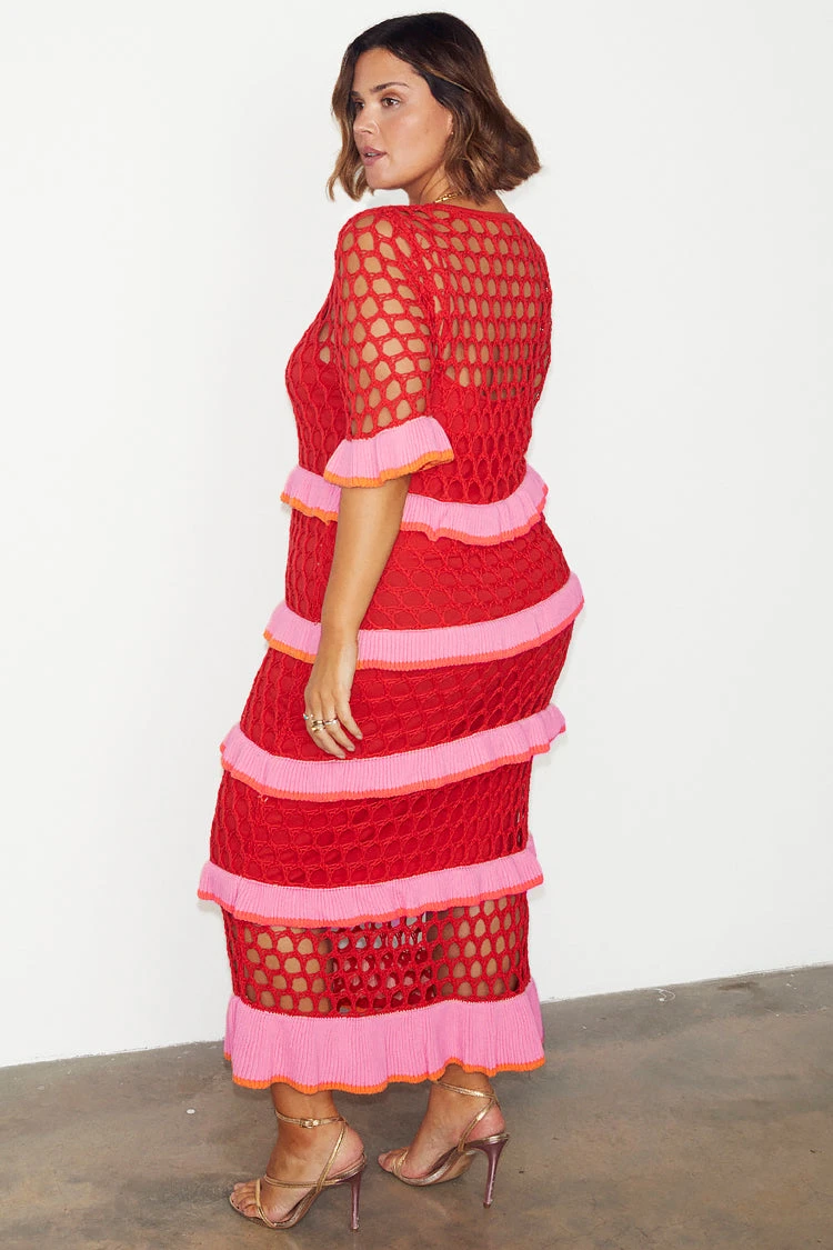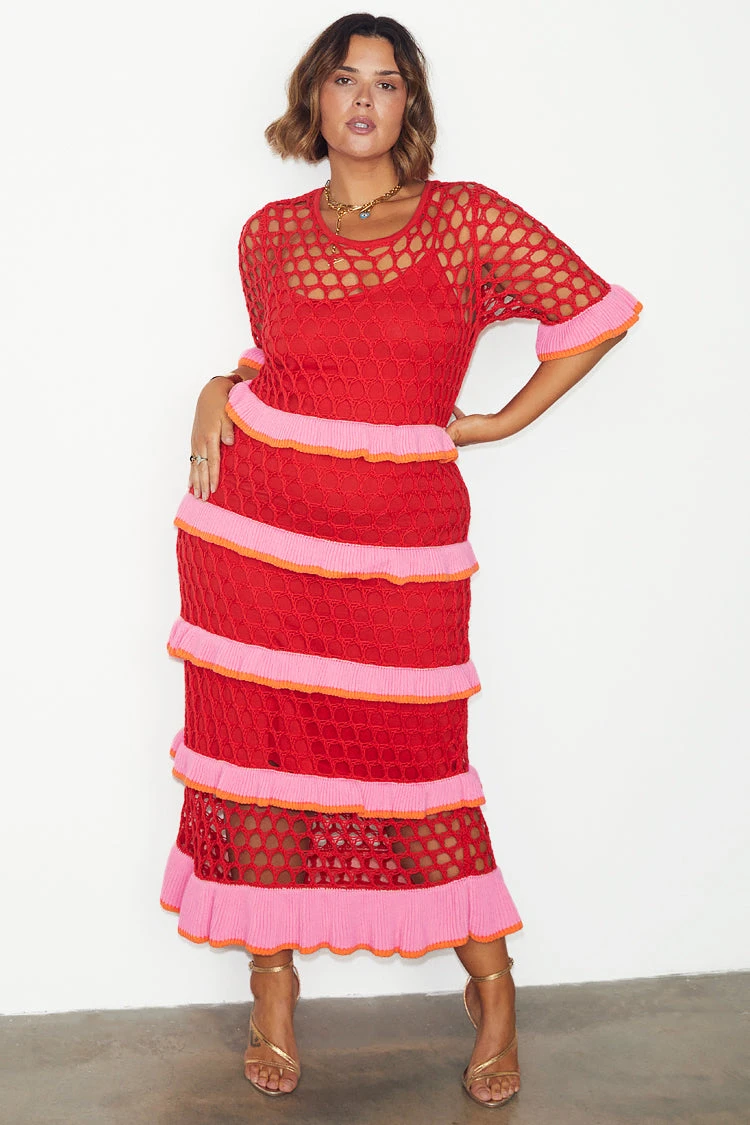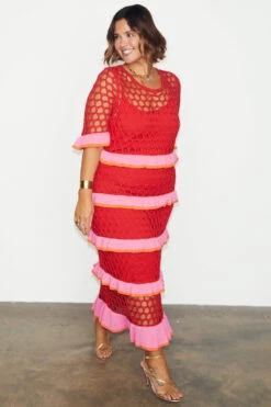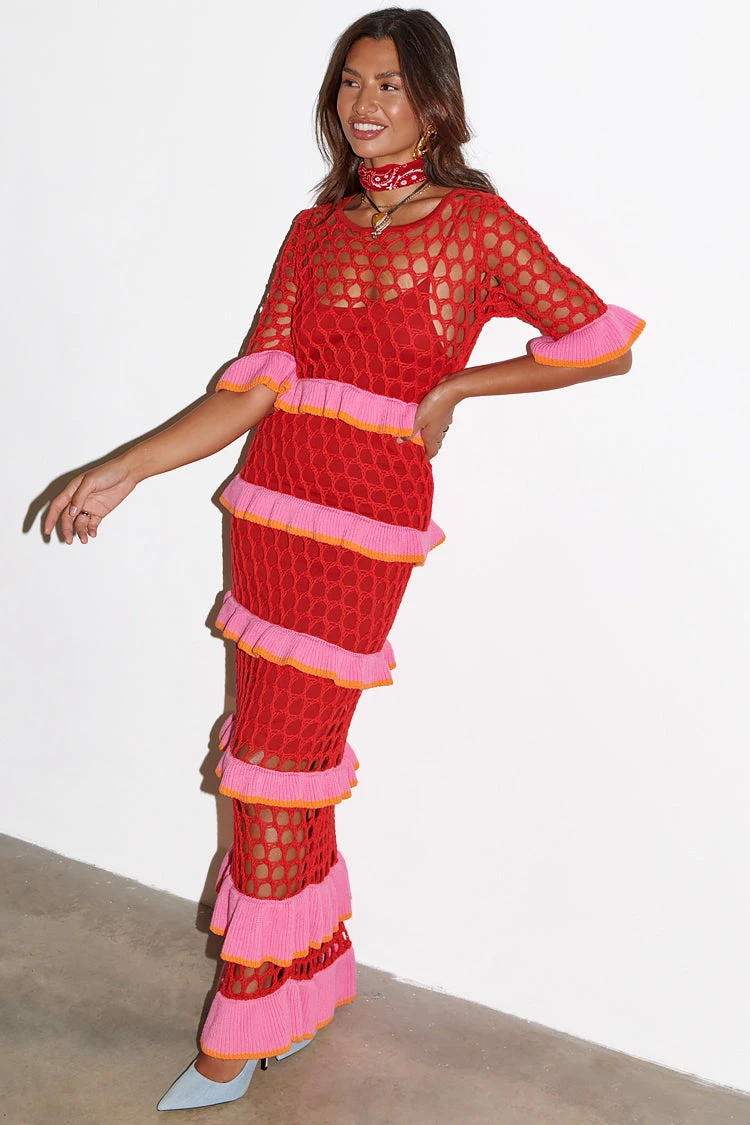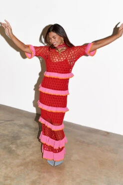 Made from a wide crochet, this dress can be worn with a slip for party wear, or thrown over swim in summer. We love to make clothes you can take through every season. Lathered in knitted frills for an extra flare, and a pink and red colour clash that we’ve loved for years. The fabric has a bit of stretch with a soft, almost fishnet structure to it. It’s for sure a head turner.