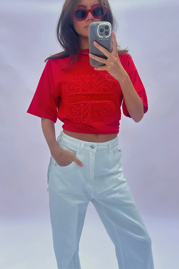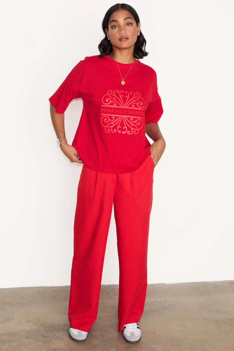 Stitched with our logo made from a soft vegan leather, colour drenched with the colour of the season, cherry red. It has a boxy shape for a structured oversized fit (not too slouchy) and has a smaller logo embroidered into the back neck.