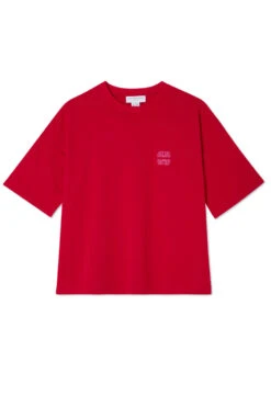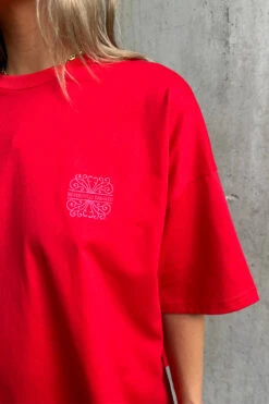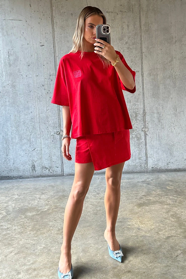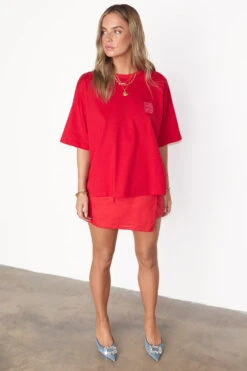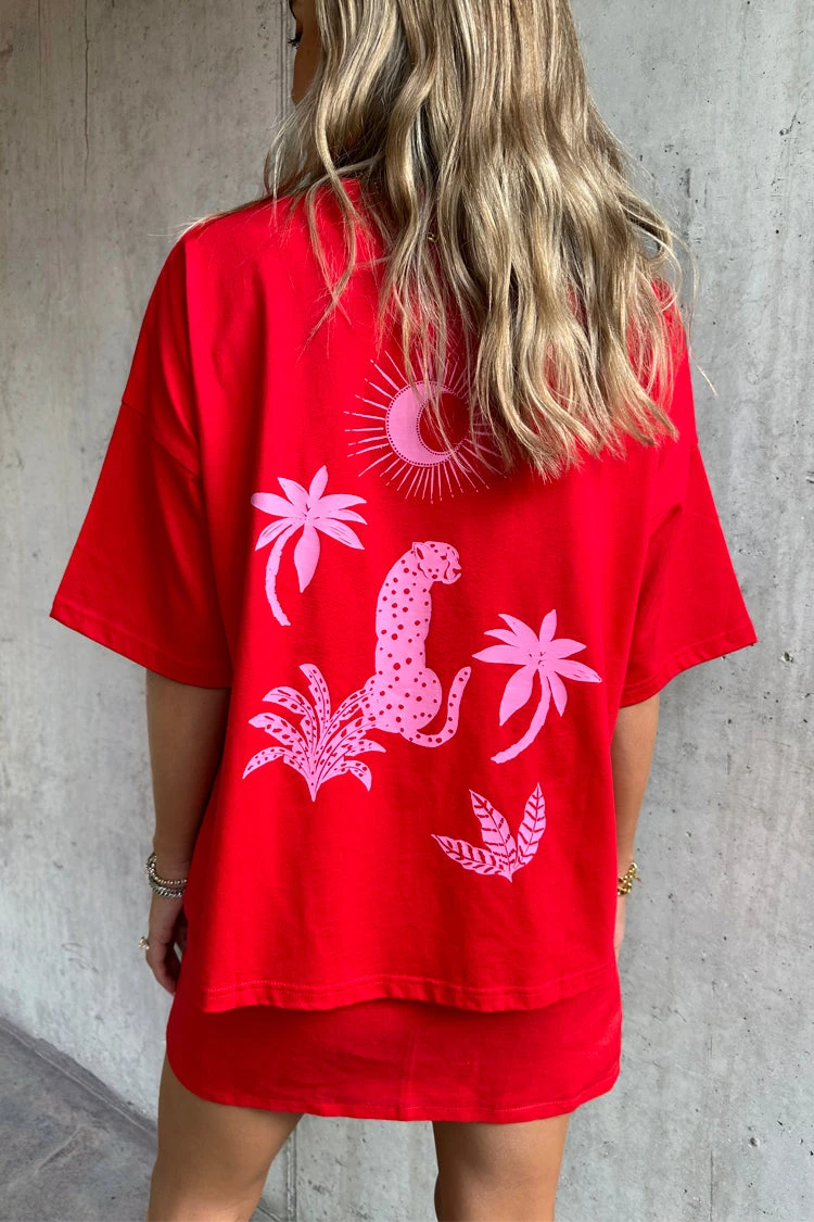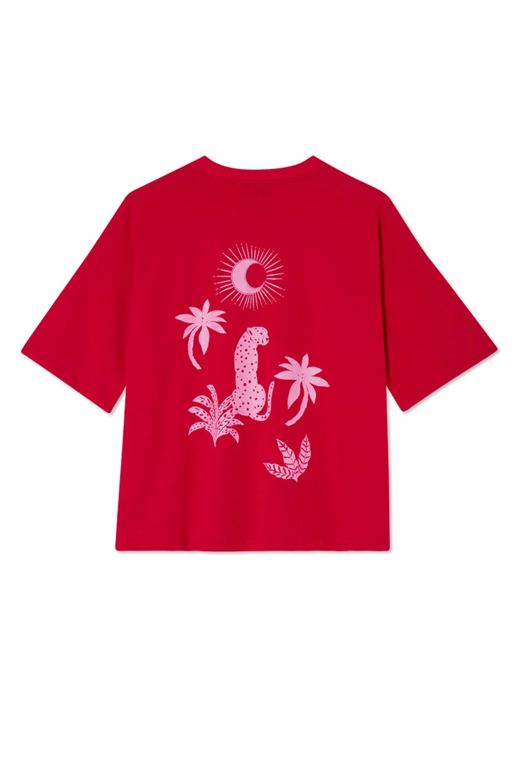 Made from a vibrant red cotton and designed with a boxy relaxed fit. It’s embroidered with a pink NFD logo on the front, and printed with palm and leopard emblems that feel really true to our brand. Red is the colour of 24, whether its paired with a matching skirt or your favorite blue denim.