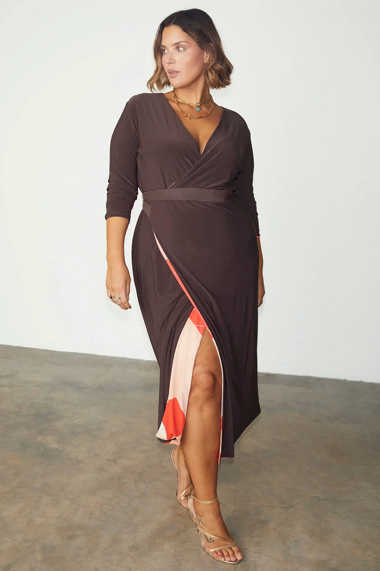 We truly believe in getting the most out of every outfit. This reversible wrap dress has a gorgeous sundial print on one side, and a chocolate block colour on the other – making it a serious investment piece. We love that the ties are double sided, so you get a pop of the reversed print when it’s tied at the waist. Made from a sleek and weighty fabric that skims the figure and looks super luxe.