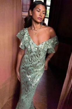 Keep it effortless but elegant in the Jacquard Tilda Dress. In our bestselling gold fleck print and with a flattering ruffled neckline, this dress is the perfect statement piece for any occasion. Also available in Pink.