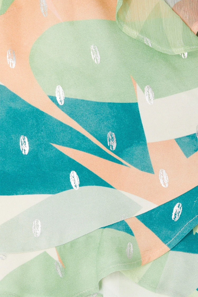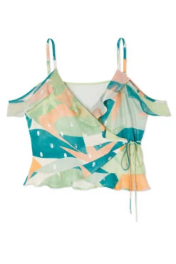 A reedition of our bestselling clover dress print from a couple of years ago, inspired by hand drawn landscapes and Spanish sunsets. This top has a little hole in the side seam to thread the tie through, and wrap at the waist. It features crossover ruffles and a cold shoulder with drapey frilled sleeves.