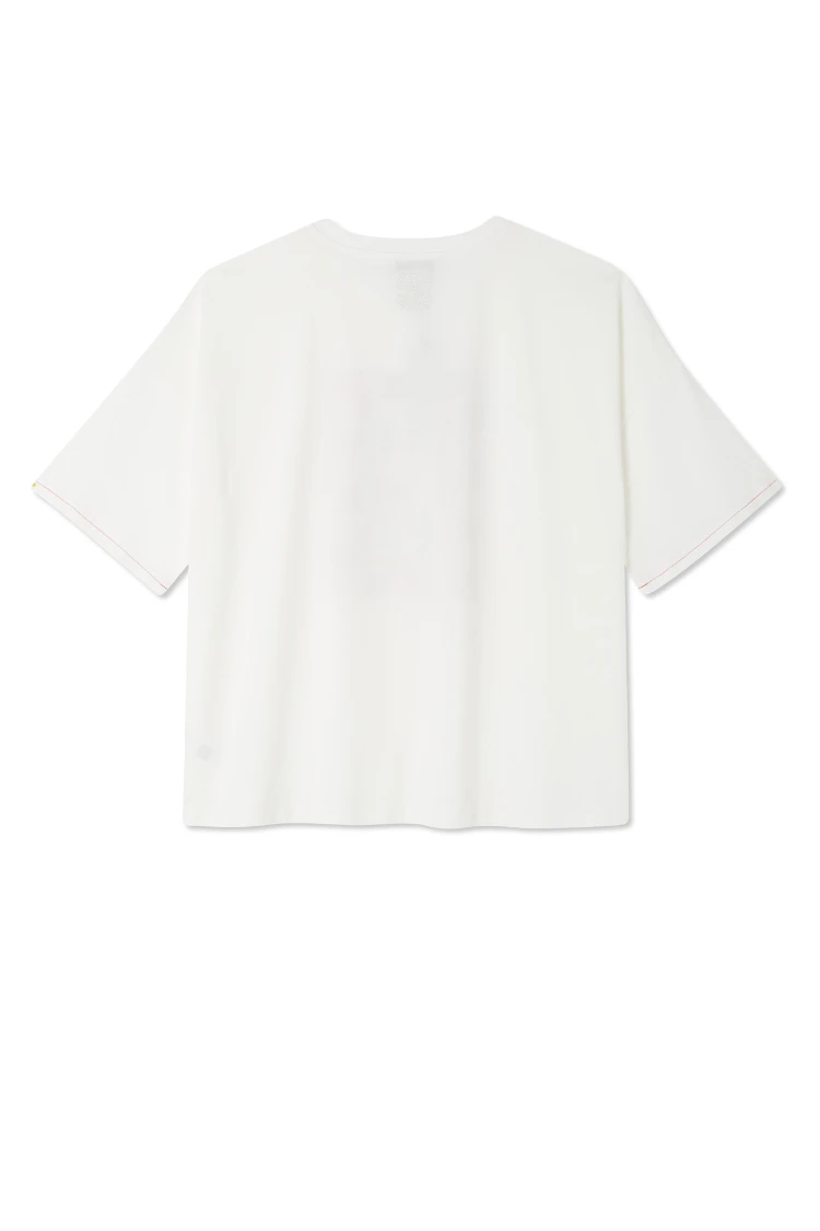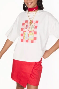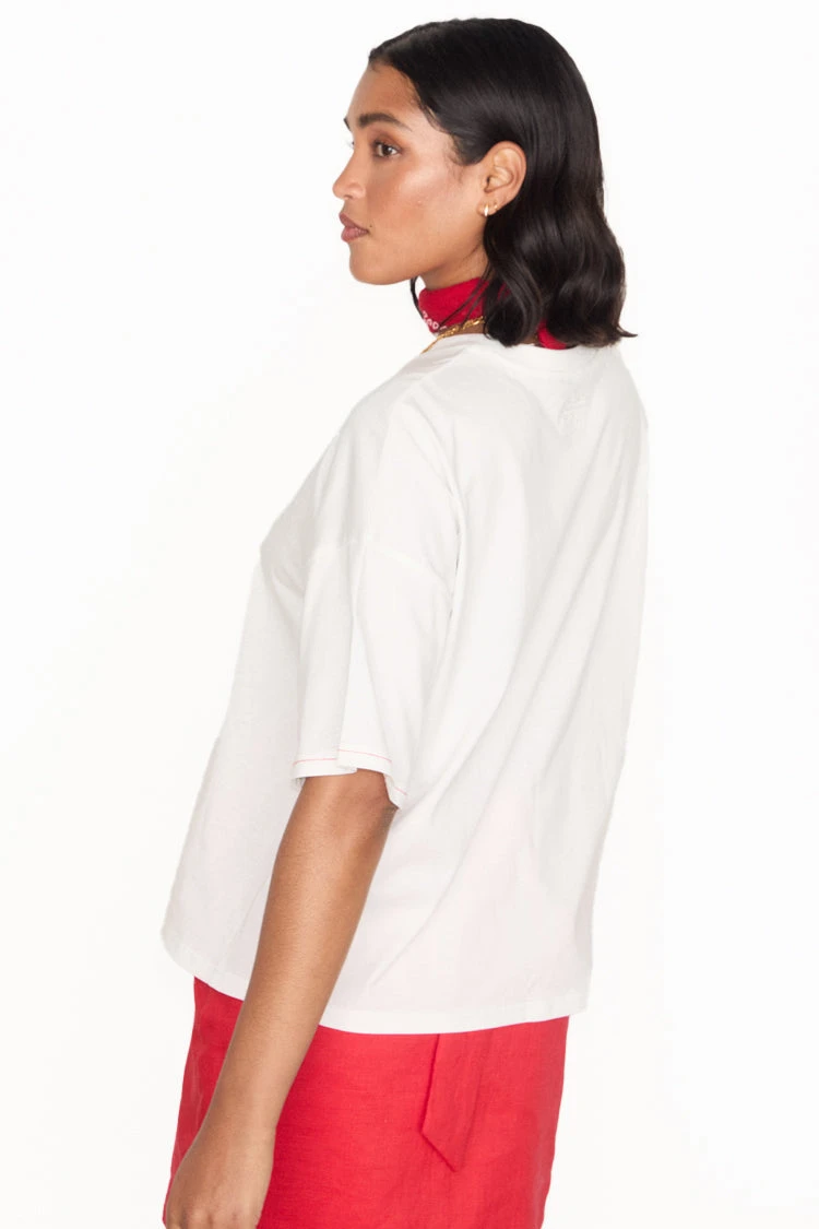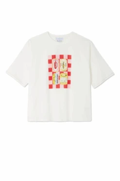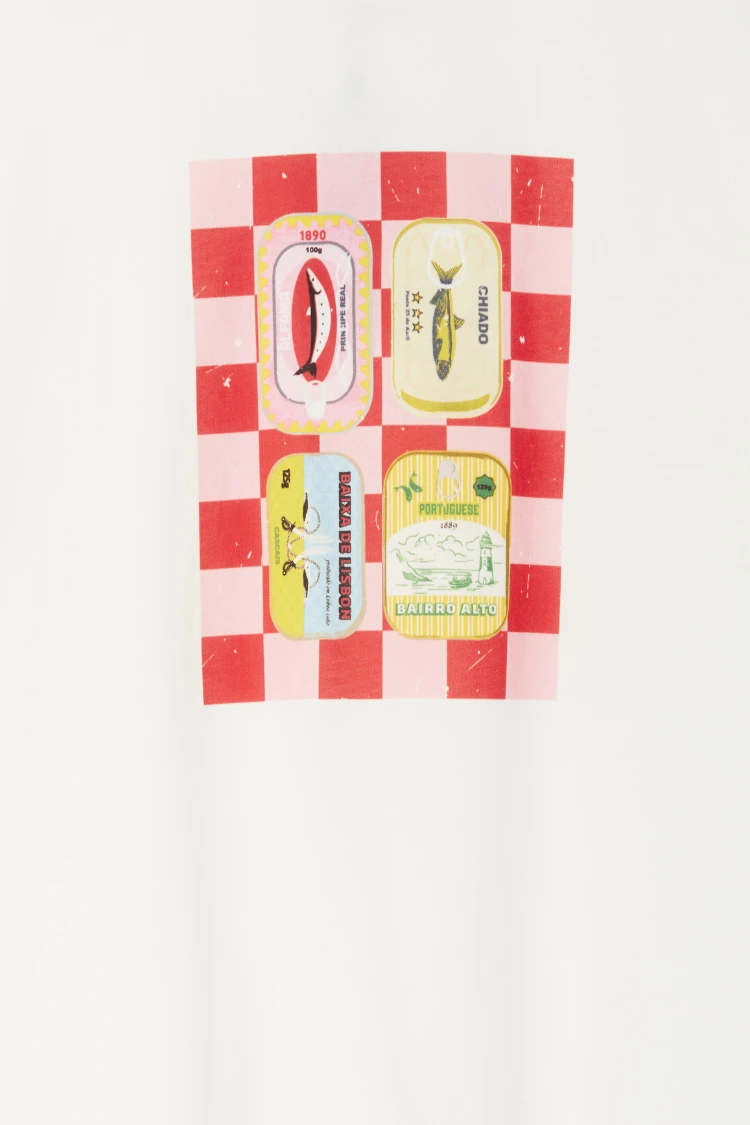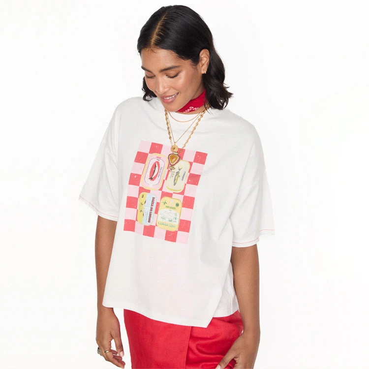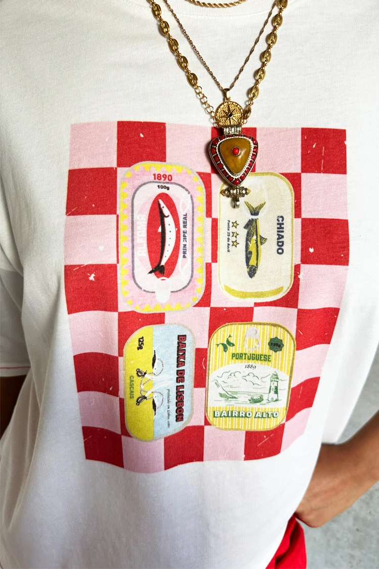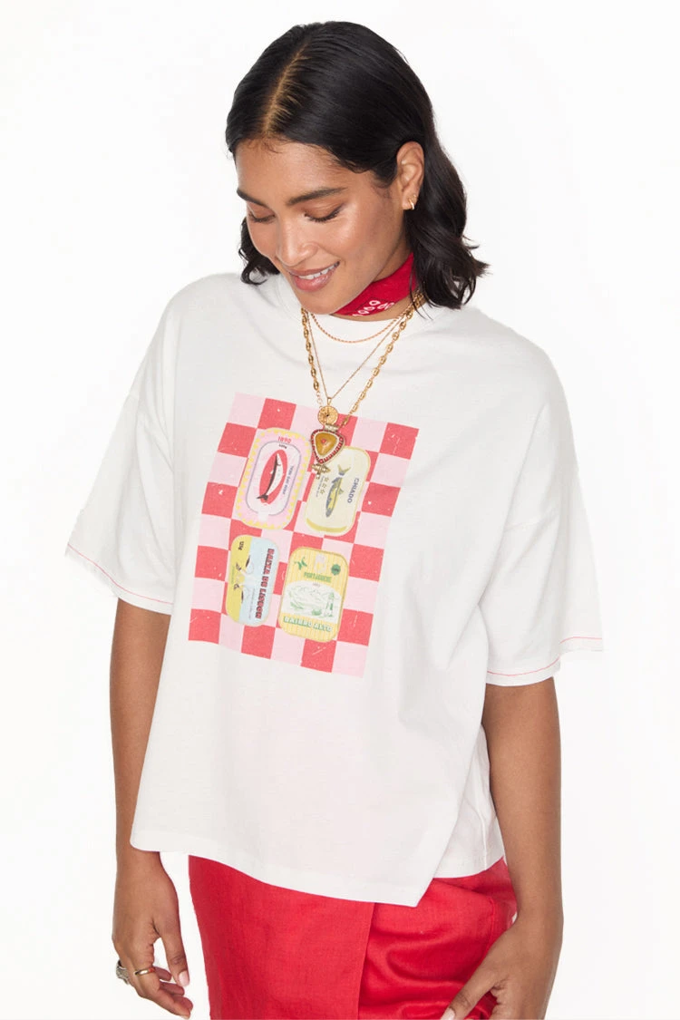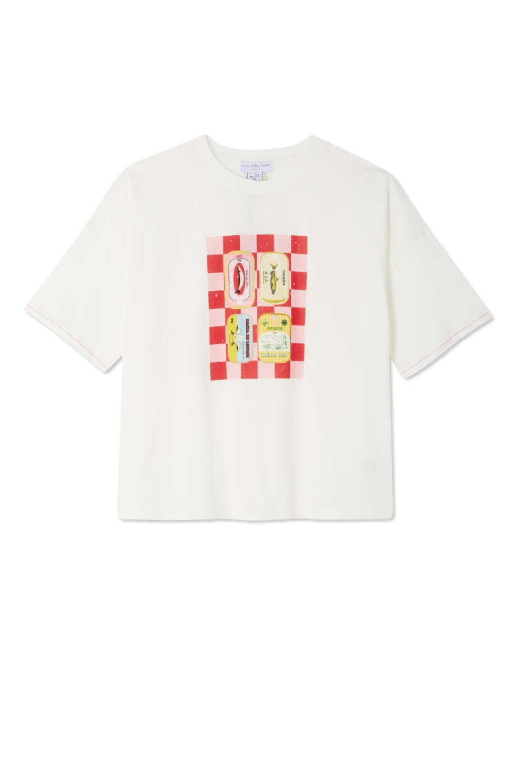 A simple tee with a bold & colourful print inspired by our teams trip to Portugal and one of the symbols of Lisbon, sardines! With a relaxed fit and dropped shoulder seams, pair with our scallop jeans or to bring in more colour tuck into a red Jaspre mini skirt.