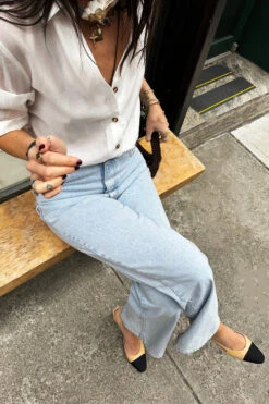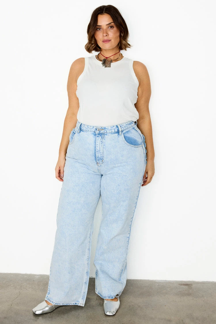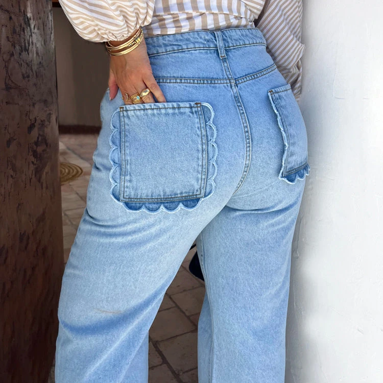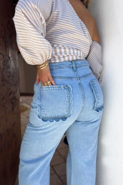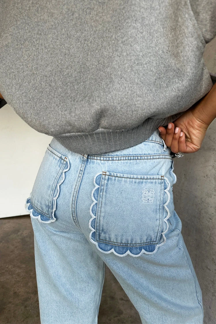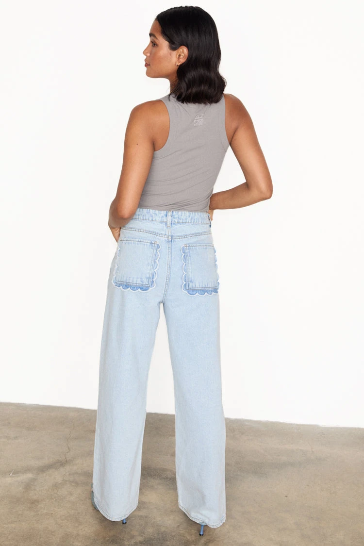 Soft denim with fresh details, scalloped pockets that make a regular jean feel so pretty and feminine. Wide leg shape that creates the perfect silhouette whether you’re in sneakers or heels. Showcase the pocket detail with a tucked in tee or shirt. Wear super elegant and fitted, or size up for a more grungy ‘sits on the hips’ look.