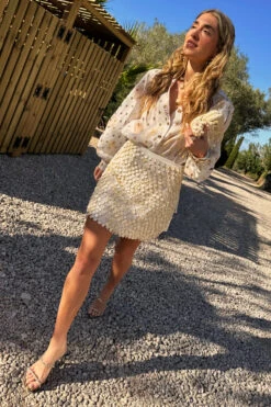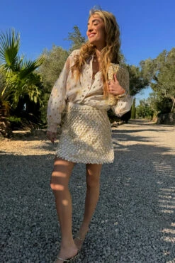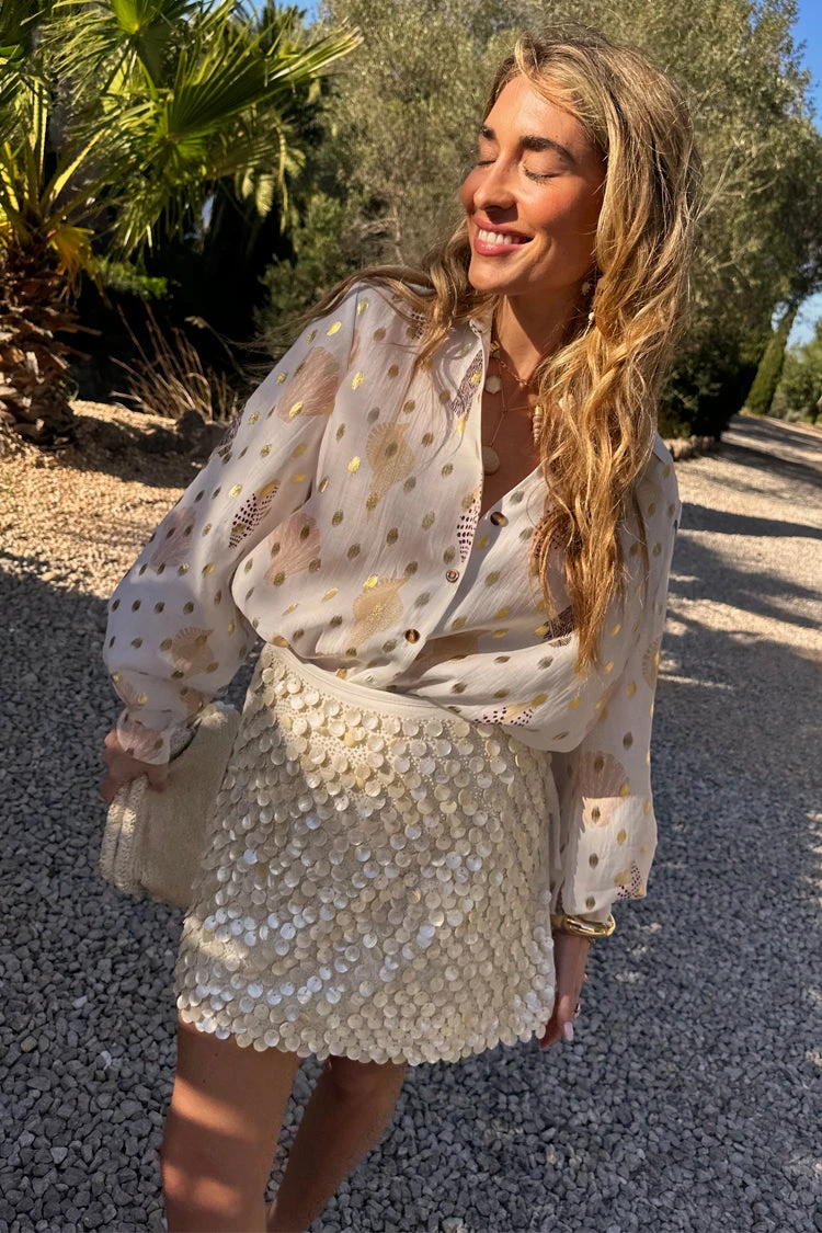 We’ve added another edition to our wrap skirt collection, but in a gorgeous new texture! Inspired by the teams trip to the Greek islands and the beautiful white beaches, we’ve added cream pearlescent sea shell beads, that shimmer in the sun, layered on top of delicate glass beads. This mini skirt is a priority on your summer party outfit checklist! Keep it simple with a plain white tee or go all out with a bolder look and add the shell Miley shirt.