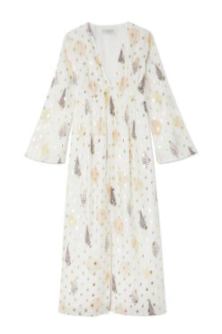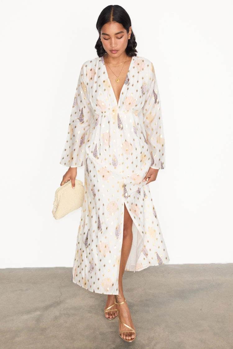With a gorgeous gold fleck and shell print, in earth tones, this dress is the perfect edition to your summer wardrobe. Take a stroll along the beach and then add some gold jewellery and heels to take the dress from day to night…