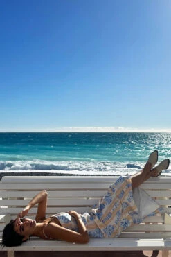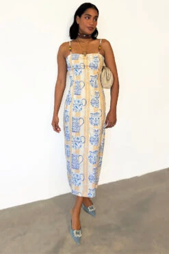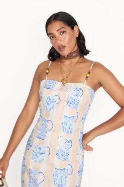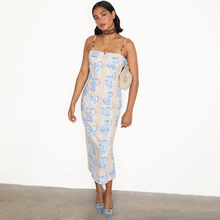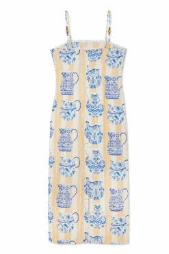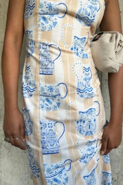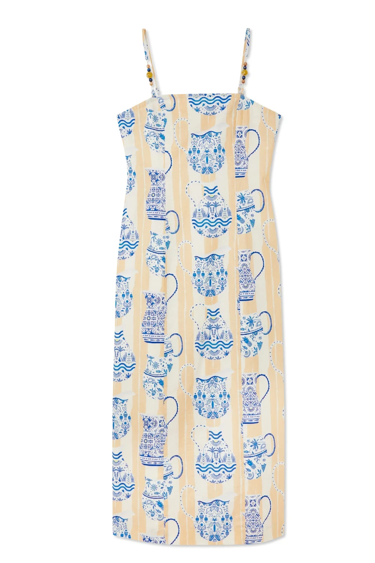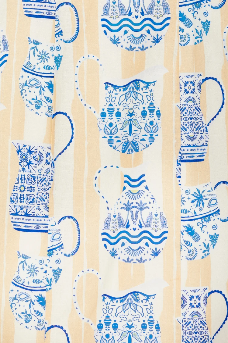 A multi destination summer is the theme this season, pulling inspiration from Portuguese tiles, Grecian palettes and Chinese ceramics, resulting in a true accumulation of our trips around the world in one standout blue and white collection. The Sicilian story gives us the revival of the jug print, a NFD favourite, once seen in our Patsy dress. A gorgeous neutral brush stroke striped base topped with white vases that are hand painted with blue and lime signature NFD elements.