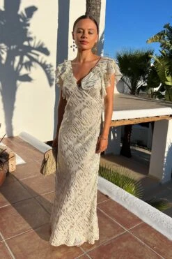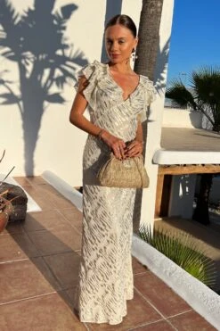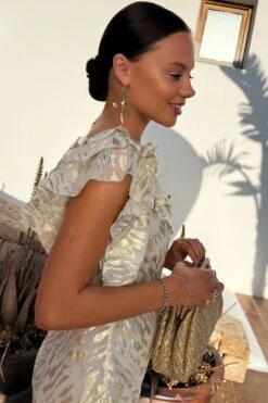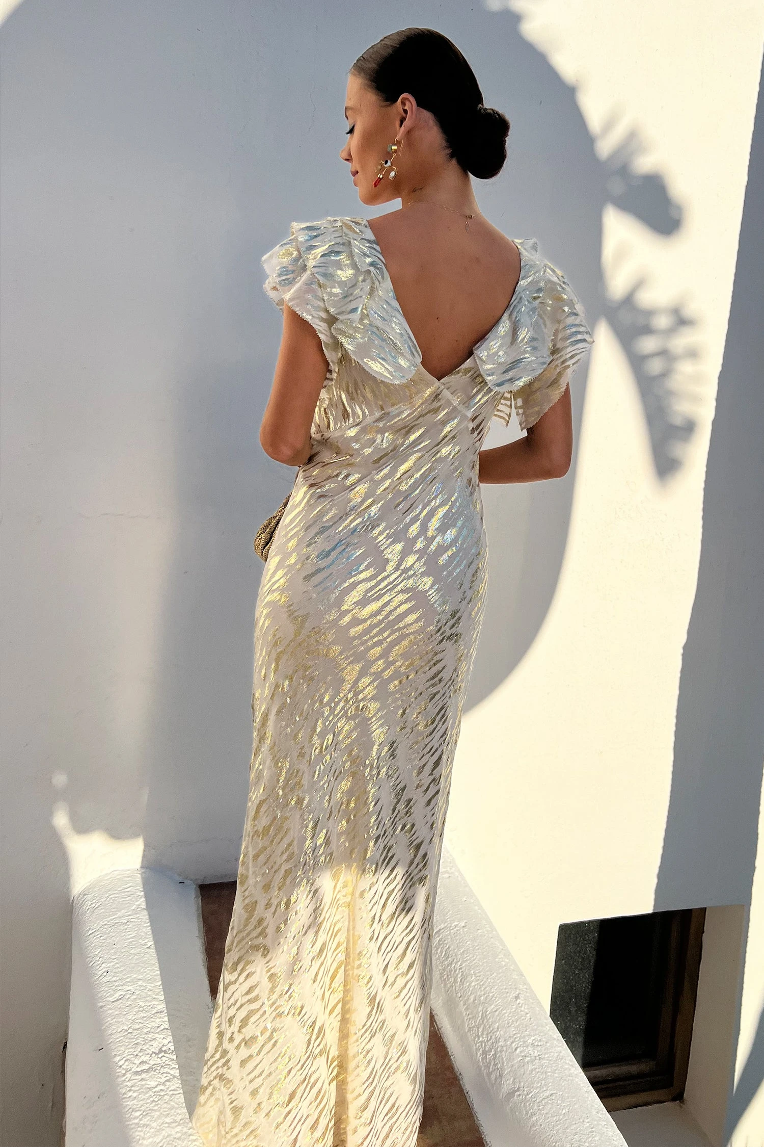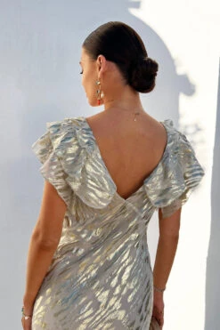 Sun catching glistening foiled flecks on a gorgeous silver lightweight base, suited to any summer occasion. Be the best dressed guest, with frills along the neckline and a flattering sleeve. Wear with our metallic heel and bold coloured clutch for all parties.