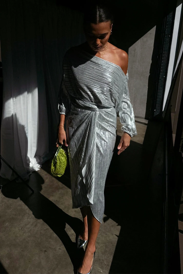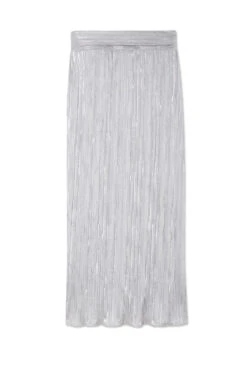 A silver plisse made up of lots of tiny pleats, that highlight the metallic when they catch the light. Lots of stretch for a comfortable fit and bit of adjustability on sizing (also great for bump dressing!). Paired with the Tilly top it transforms into an occasion dress, but as always, pair with a white tee and trainer for day dressing.