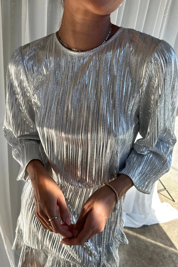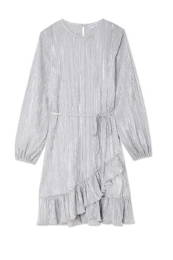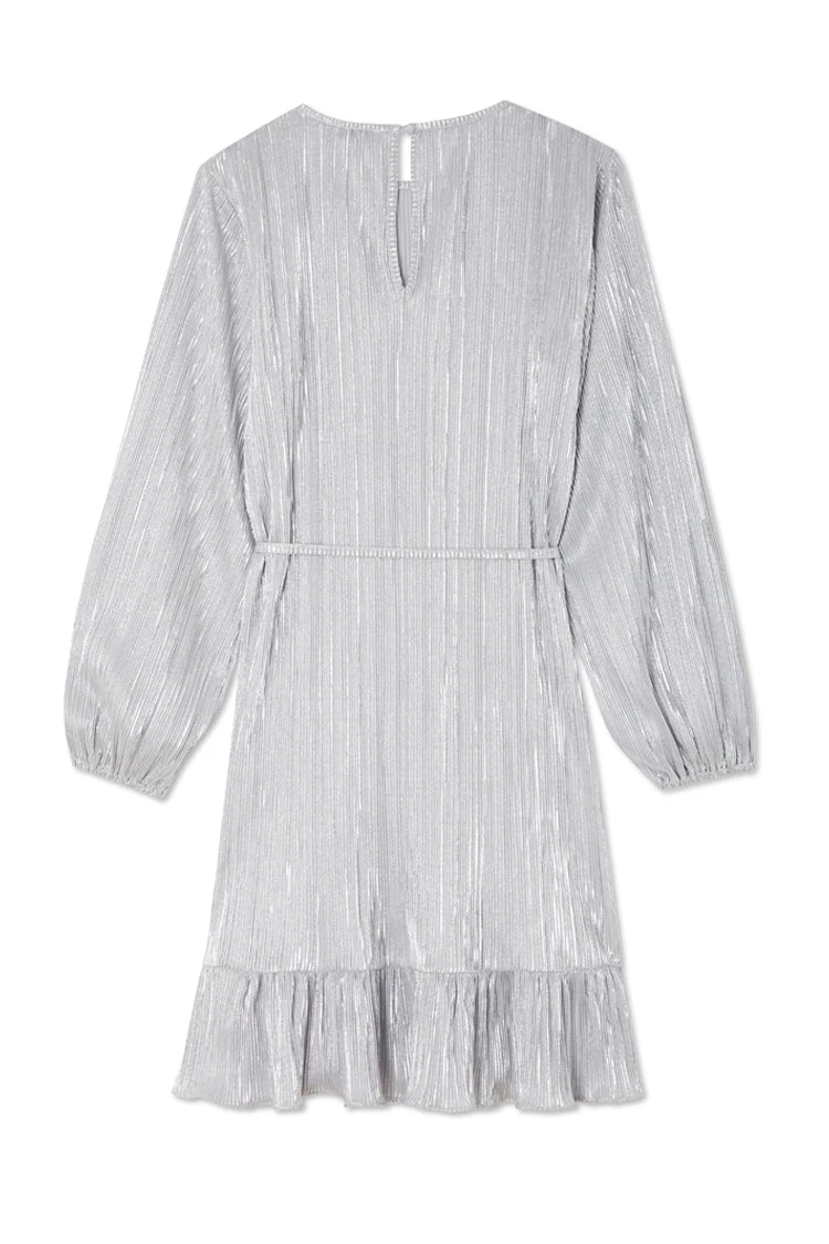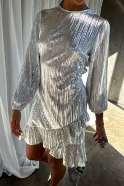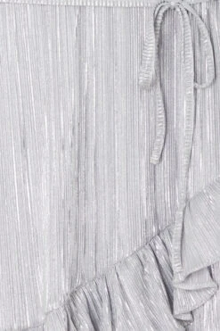 Silky silver plisse that catches the light in each little fold, and creates a beautiful almost holographic shimmer. It has a little belt for definition on the waist, and a ruffled wrap around hem. Perfect to take through festival to party seasons.