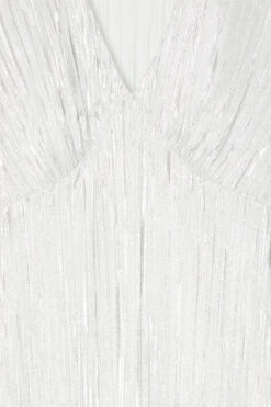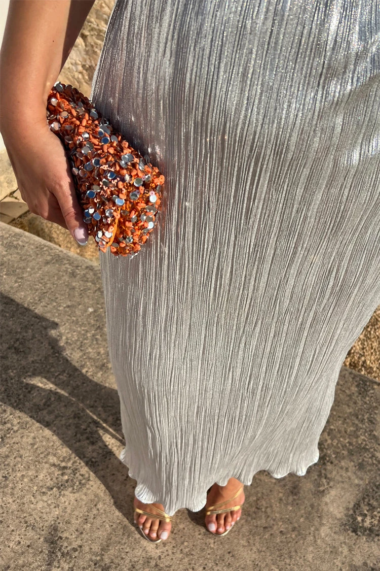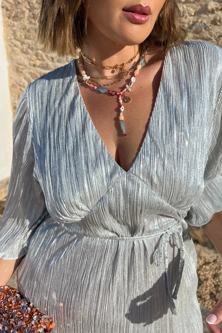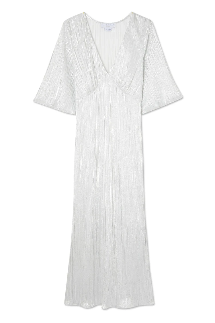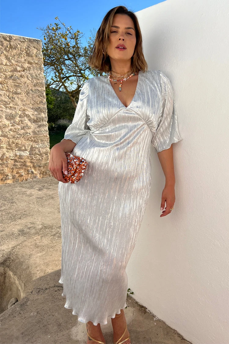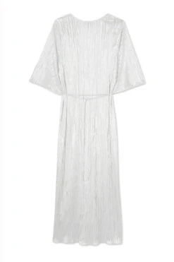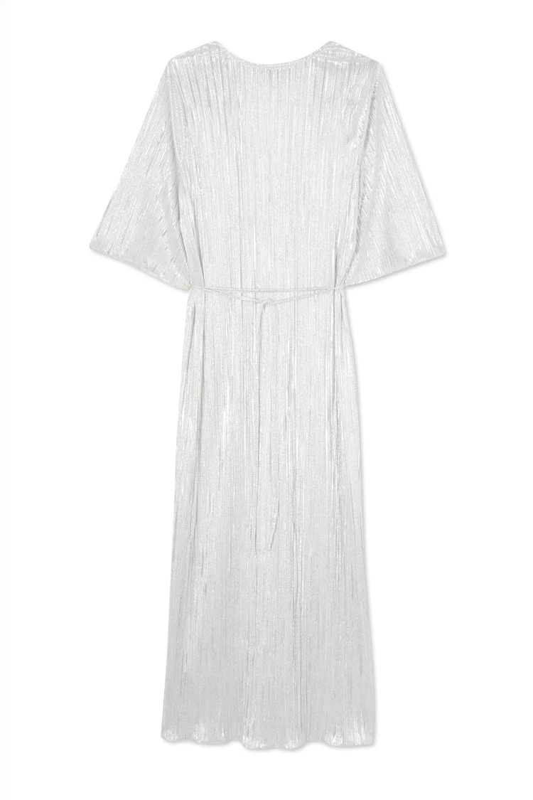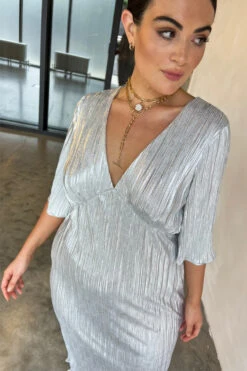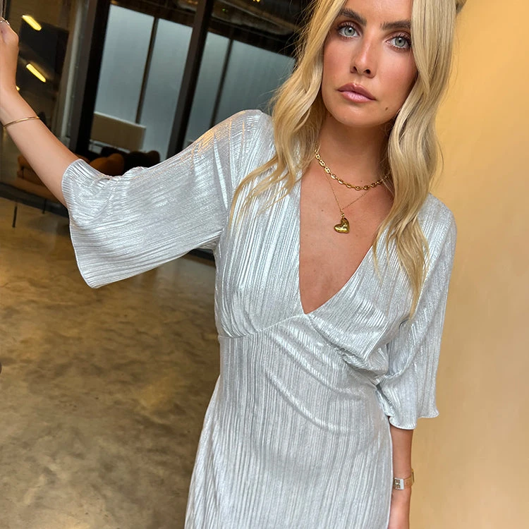 Silky silver plisse that catches the light in each little fold, and creates a beautiful almost holographic shimmer. With effortlessly retro angel sleeves and soft pleated cups – you can wear loose to continue the 70s look, or belt it for more definition.