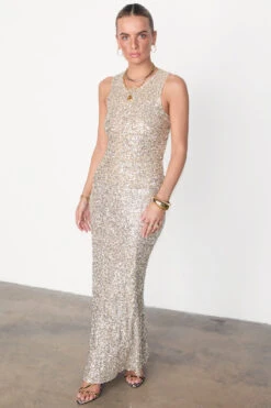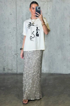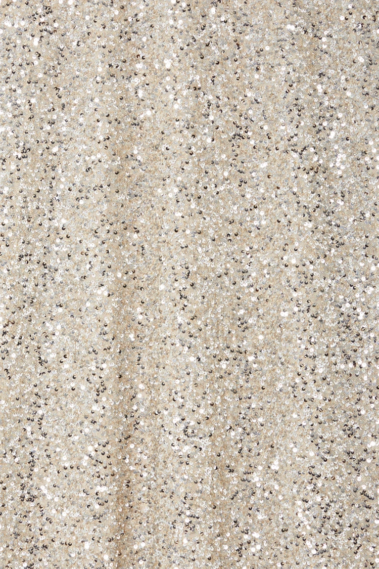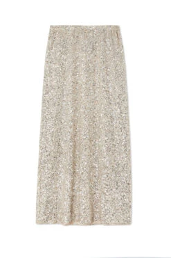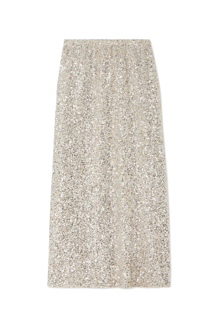 Crafted from hundreds of sequins that are highlighted by the sunshine, and with it being a classic silver (so in right now and always), it’ll take you from festivities through to festivals. With the silhouette of a slip skirt, lined with a heavy gloss satin to drape the figure flawlessly.