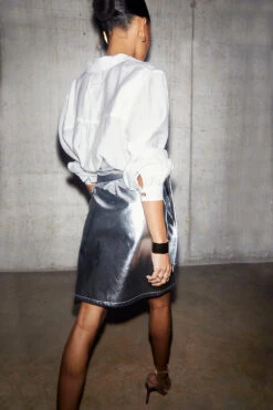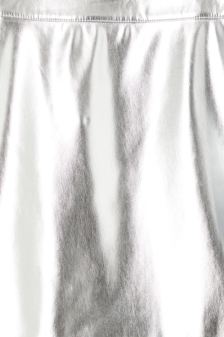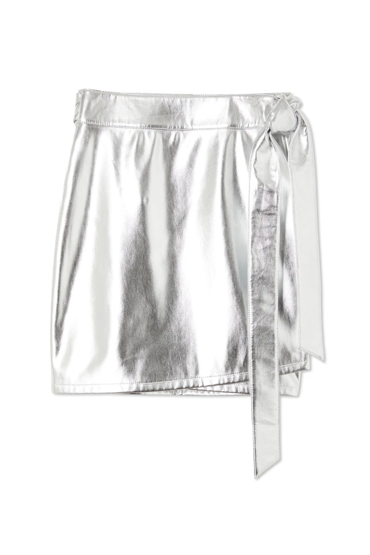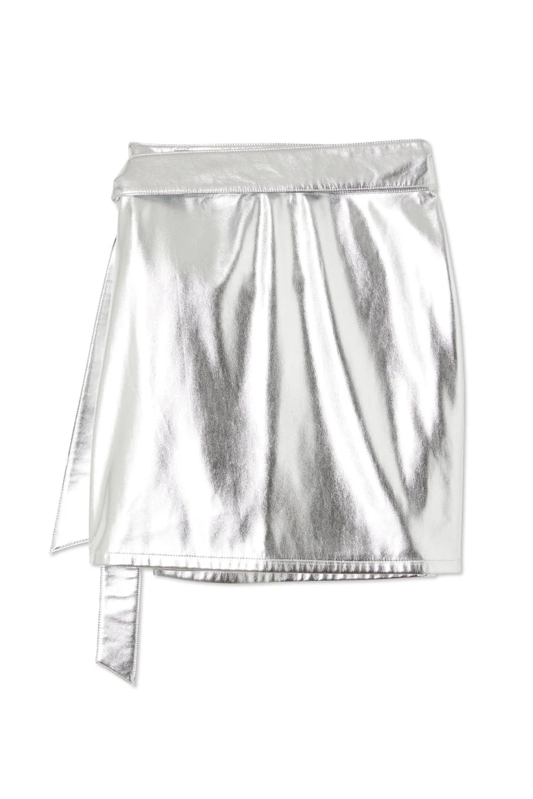 Cut from supple silver vegan leather, this mini skirt can be used to add a touch of glamour to an understated look (maybe an oversized blazer and chunky sneaker?) or paired with a tank and stilettos like we did.