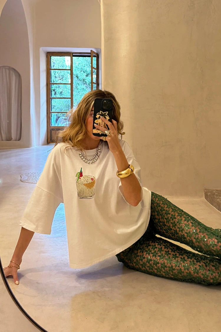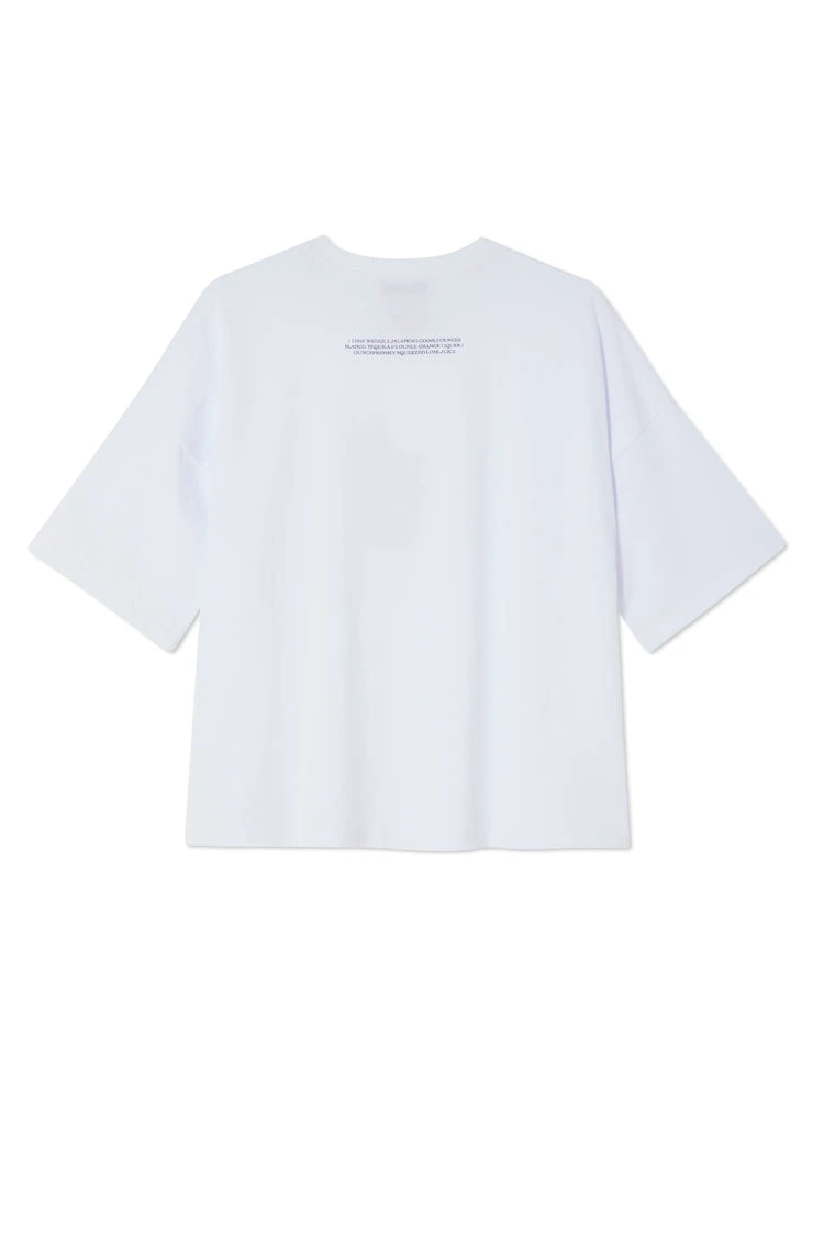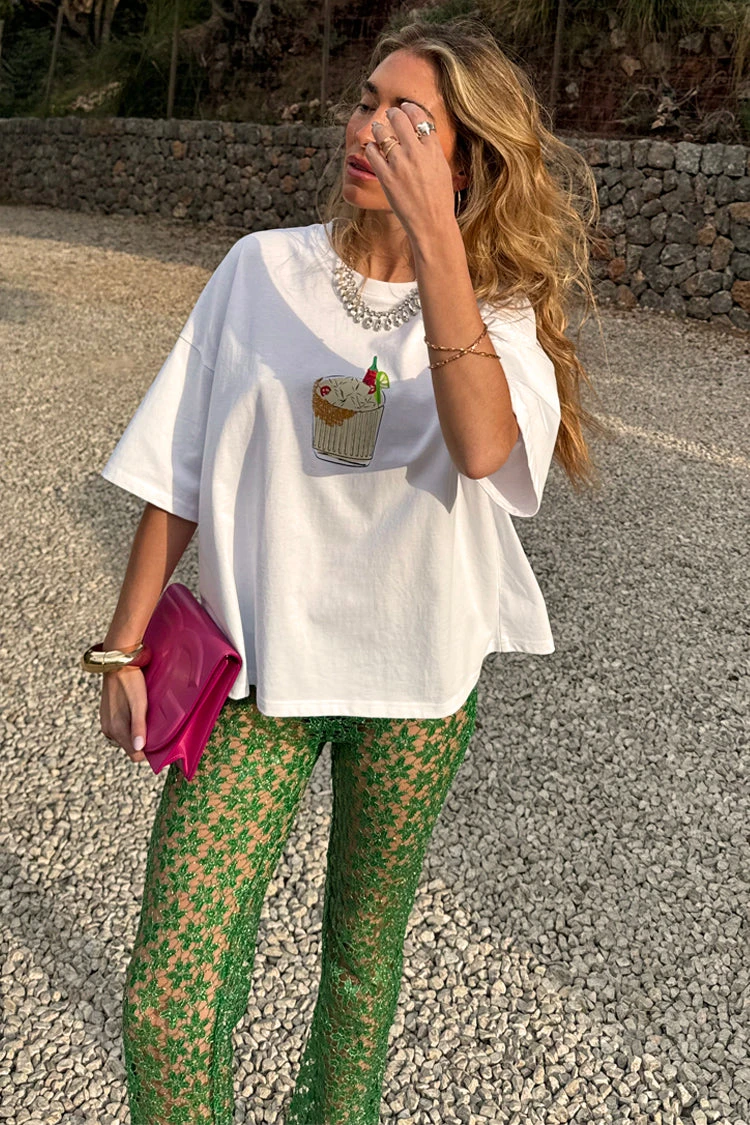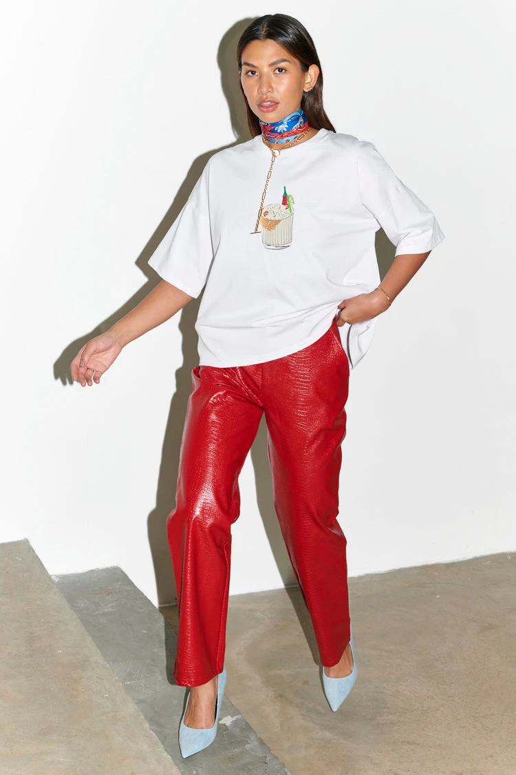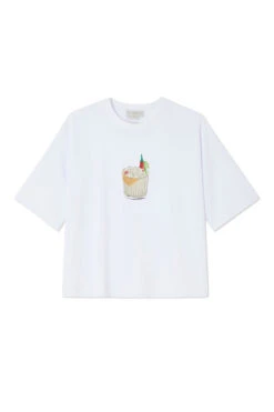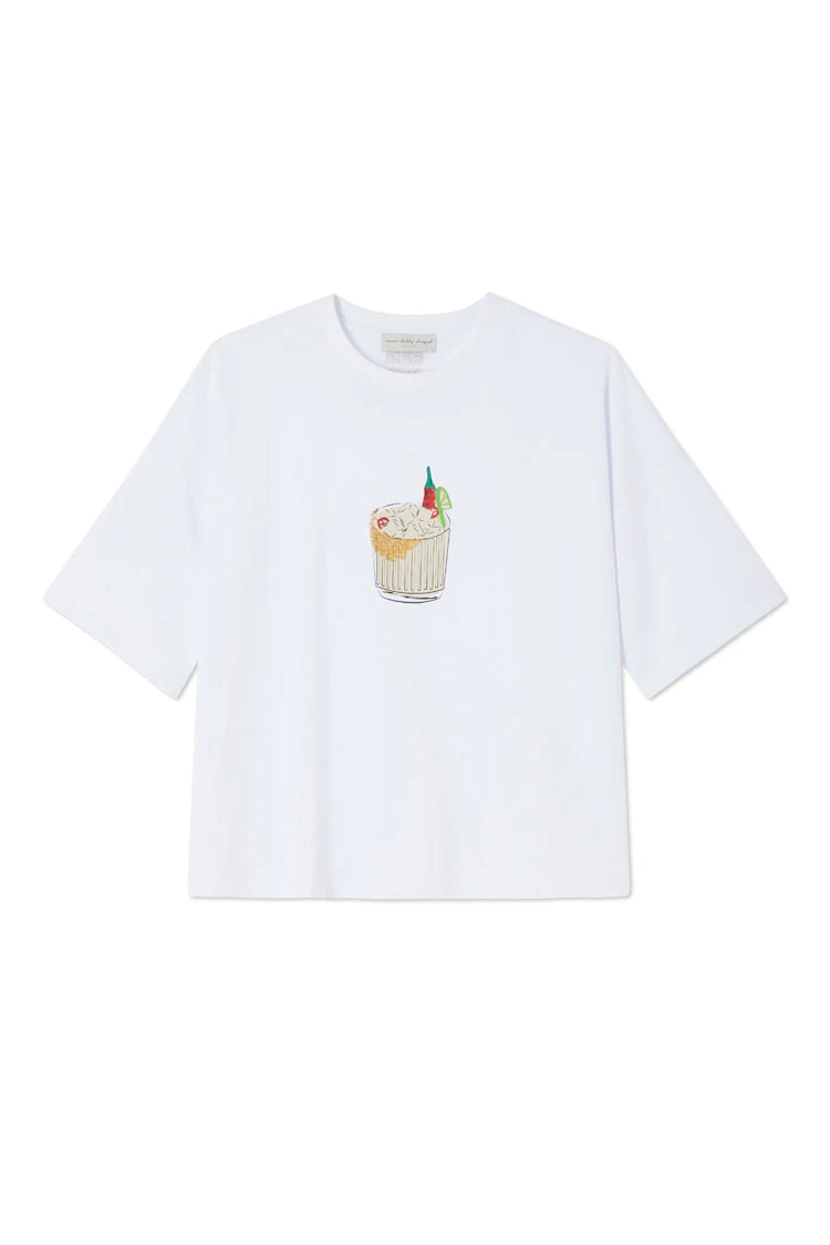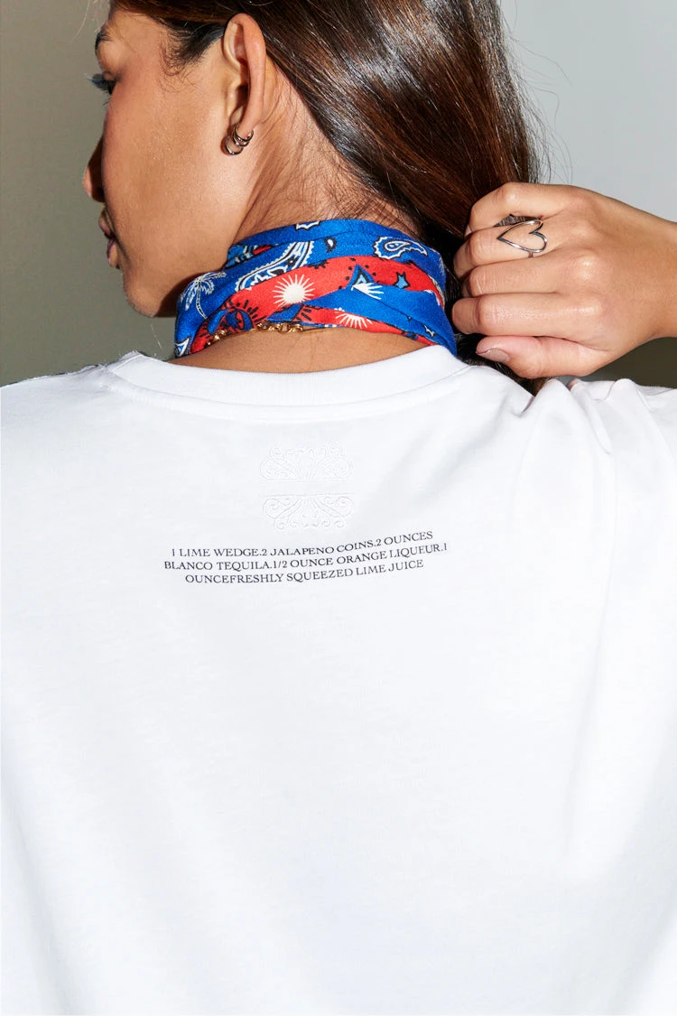 A boxy white tee, stamped with a gorgeous little cocktail illustration made by our in-house design team. With a boxy fit and slightly oversized look, you can take it from date night with leather trousers and a heel, to coffee runs with jeans and trainers. Embroidered with our NFD logo on the back neck, above a little ingredients list for a spicy marg. 🌶