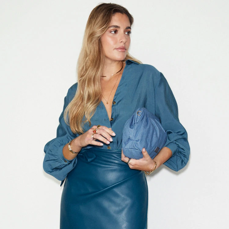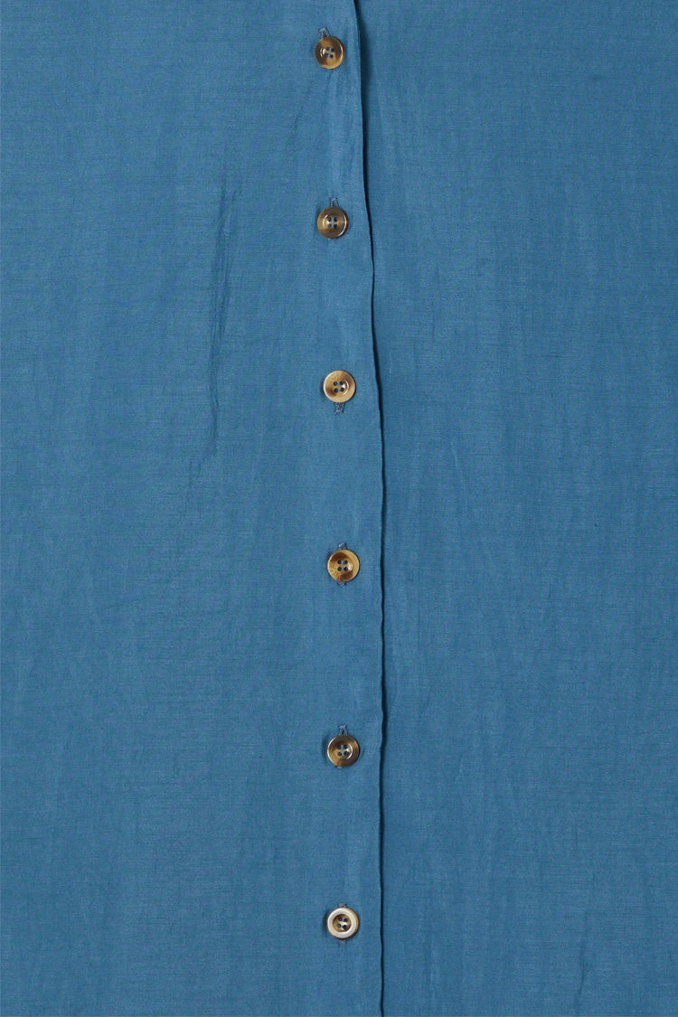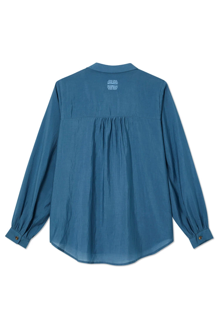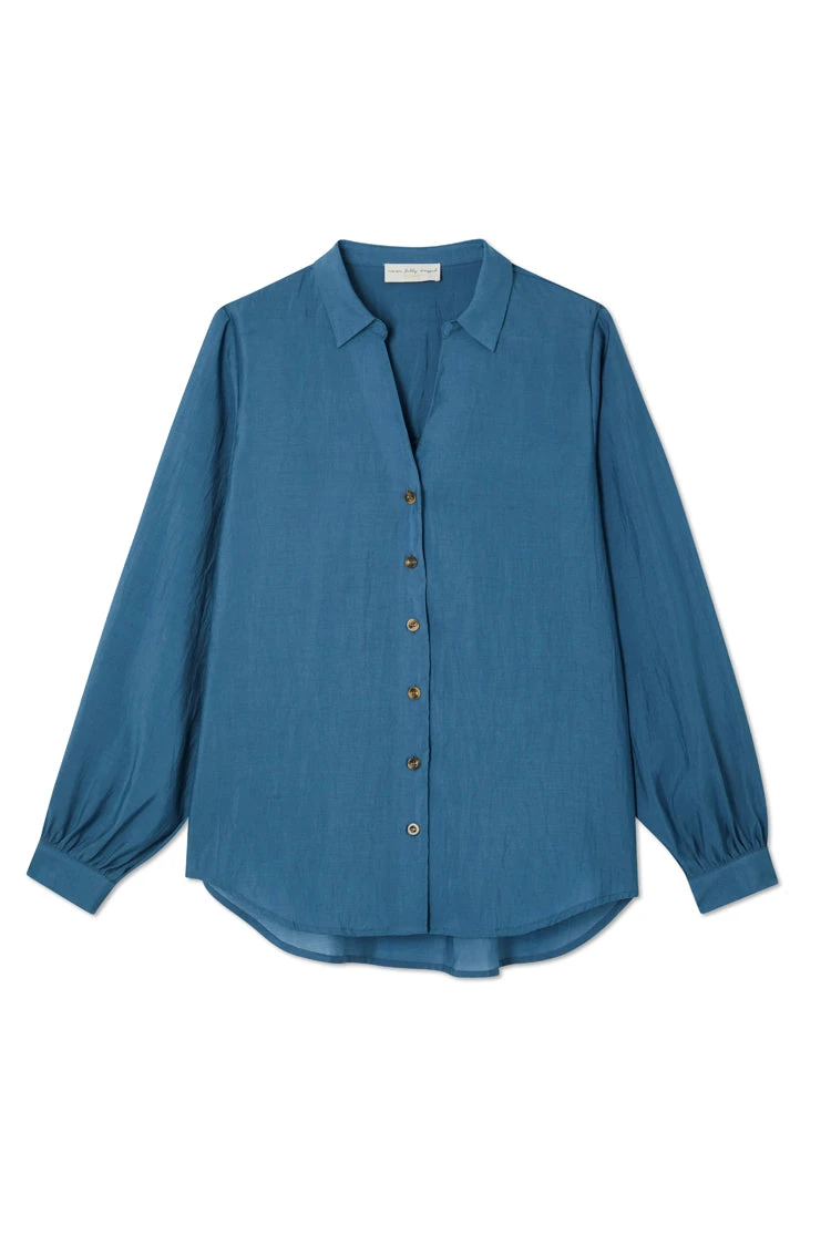 A super wearable teal shirt, blouson sleeves and a floaty silhouette. A very slight sheerness for a luxe and lightweight feel but solid enough for everyday work wear. We have added contrast tortoise summarys for an extra touch of interest and gorgeous embroidered logo on the back neck.