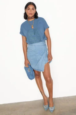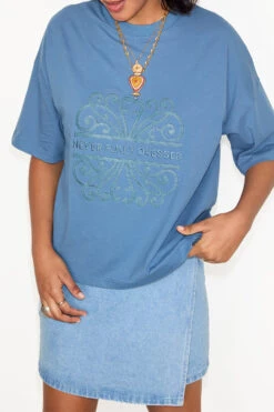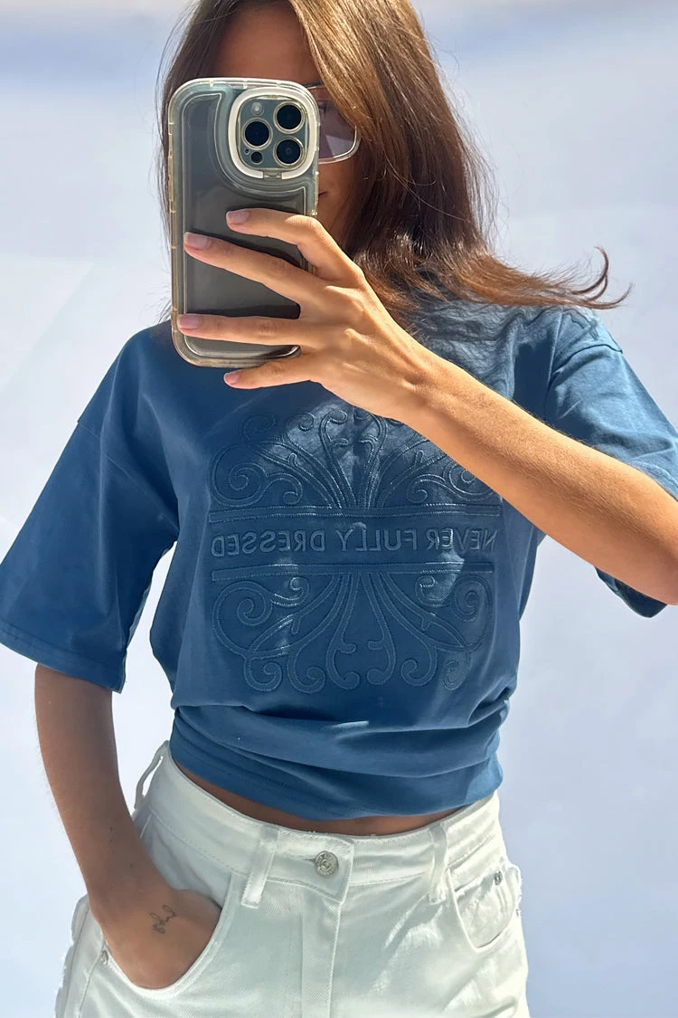 Stitched with our logo made from a soft vegan leather, colour drenched with a washed blue. It has a boxy shape for a structured oversized fit (not too slouchy) and has a smaller logo embroidered into the back neck.