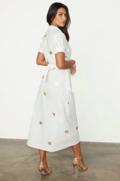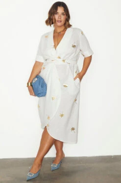 Our Brooklyn wrap dress has a wraparound collar (sophisticated detail that allows you to take it from desk to dusk), and an adjustable wrap waist for a definition and versatile styling options. An exclusive metallic palm fleck, inspired by our design team’s trips to the sunny Spanish islands.