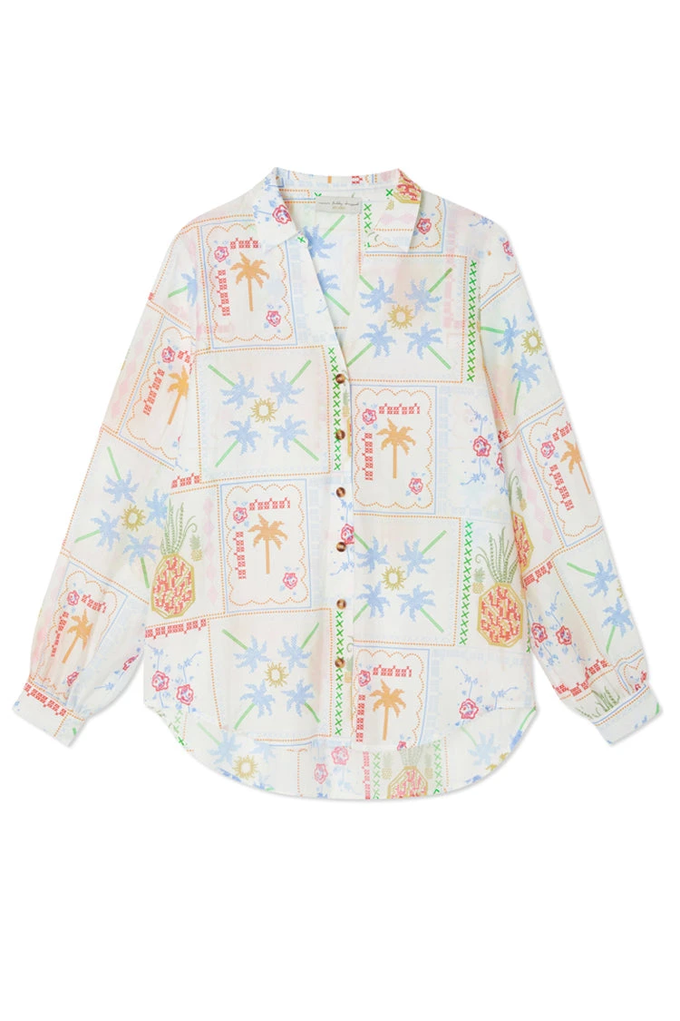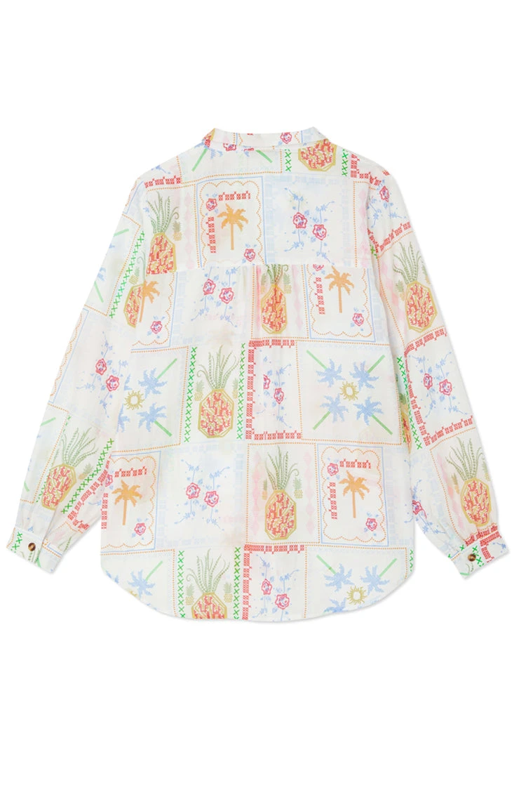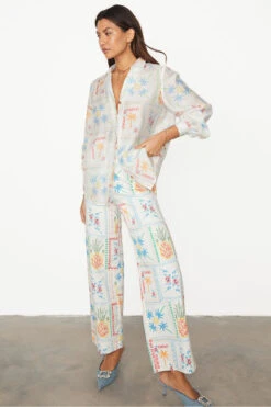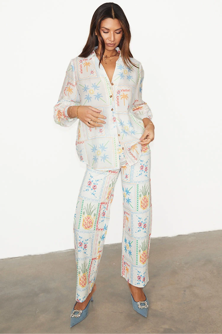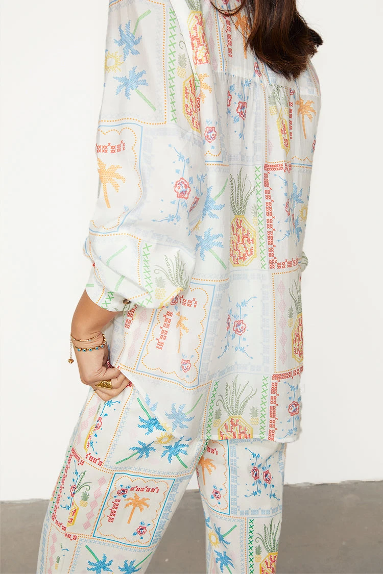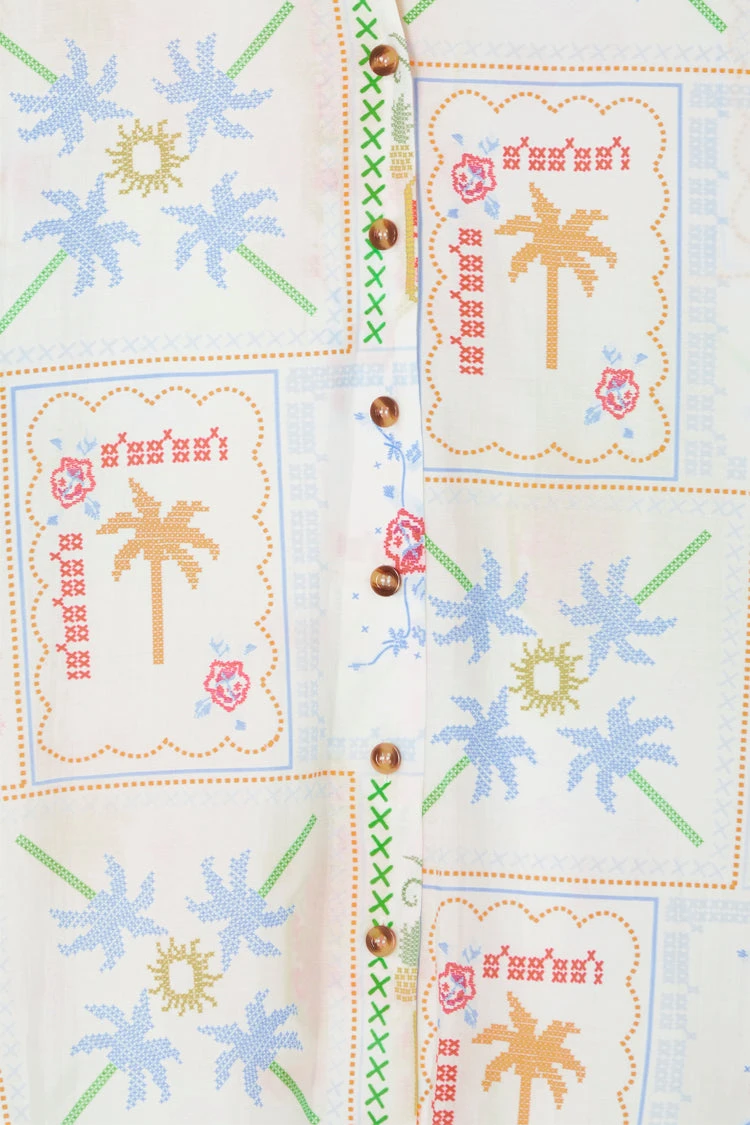 With a gorgeous tropical, cross stitch print featuring a range of iconic NFD motifs like, suns, pineapples and palms and our statement tortoise summarys. Whether your taking a stroll along the beach in the matching Marra trousers or heading out for the night in the Mini Jaspre and a pair of heels, the classic NFD Miley is a perfect summer wardrobe staple.