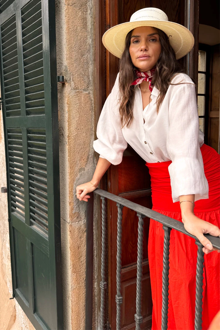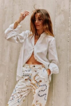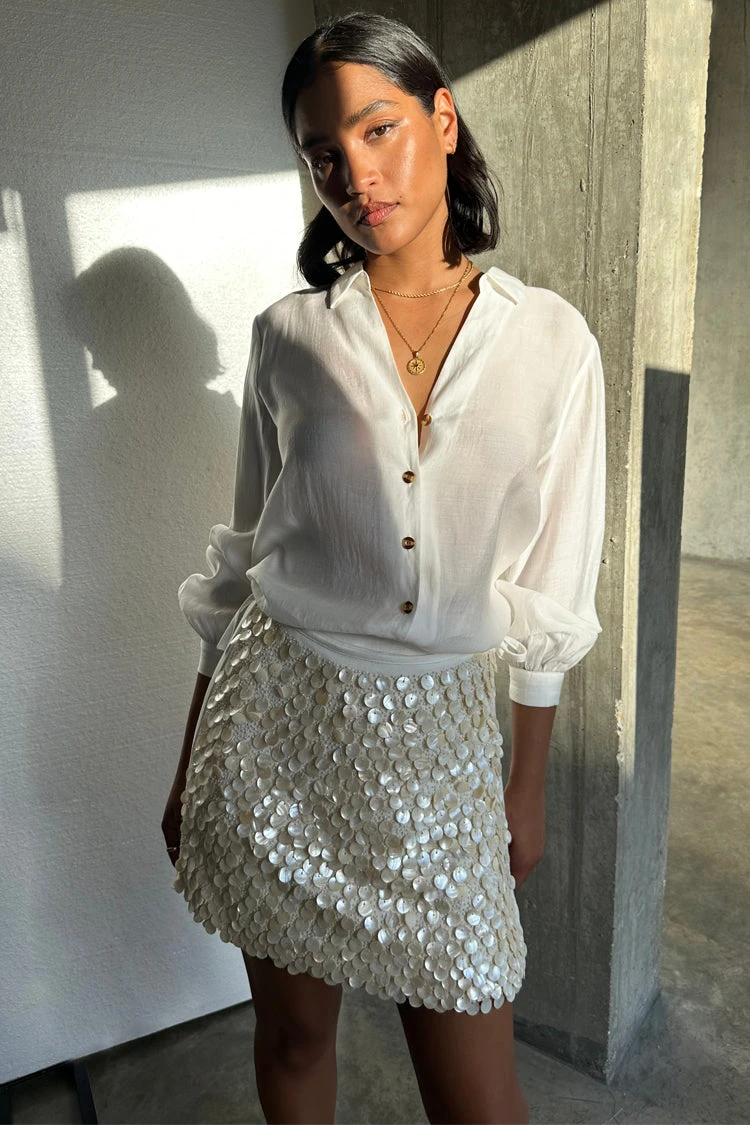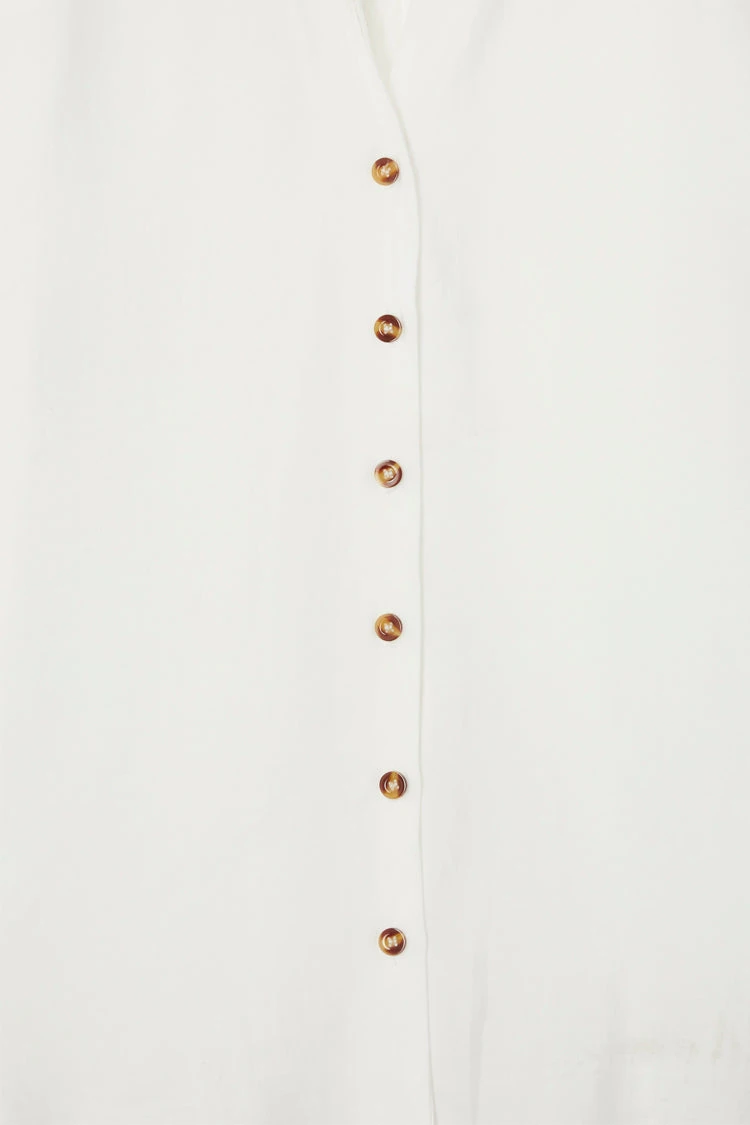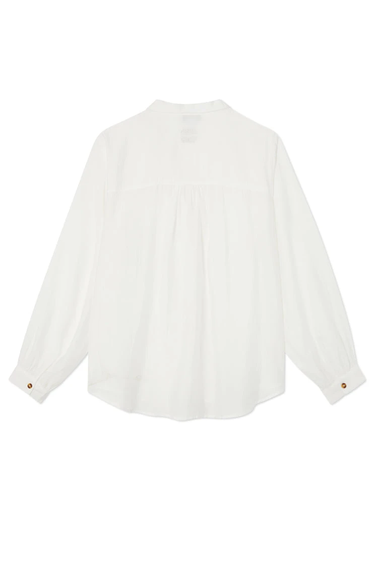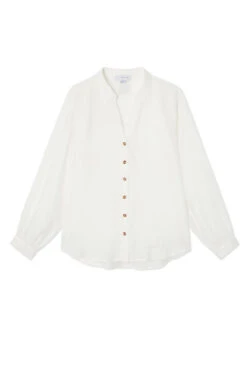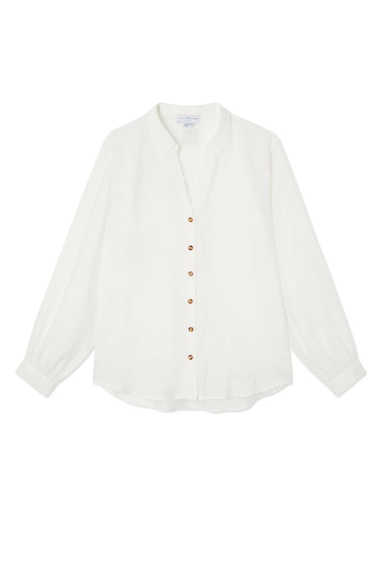 The most wearable white shirt ever! A very slight sheerness for a luxe and lightweight feel but solid enough for everyday work wear. We have added contrast tortoise summarys for an extra touch of interest and gorgeous embroidered logo on the back neck.