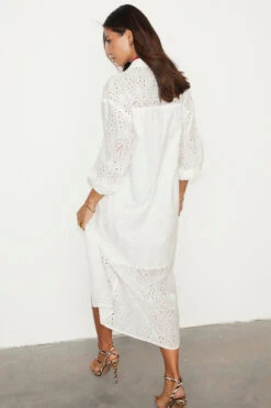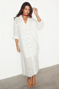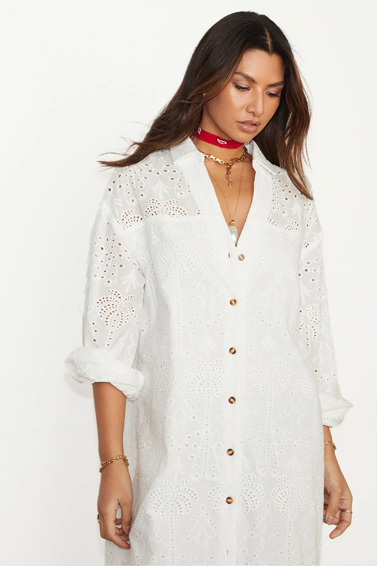 This broderie design was curated by our in-house design team, inspired by their trips to the spanish islands. The beloved palms are a recurring theme throughout our collections because they feel like balmy beach evenings and sunshine on the skin. A perfect day to evening dress.