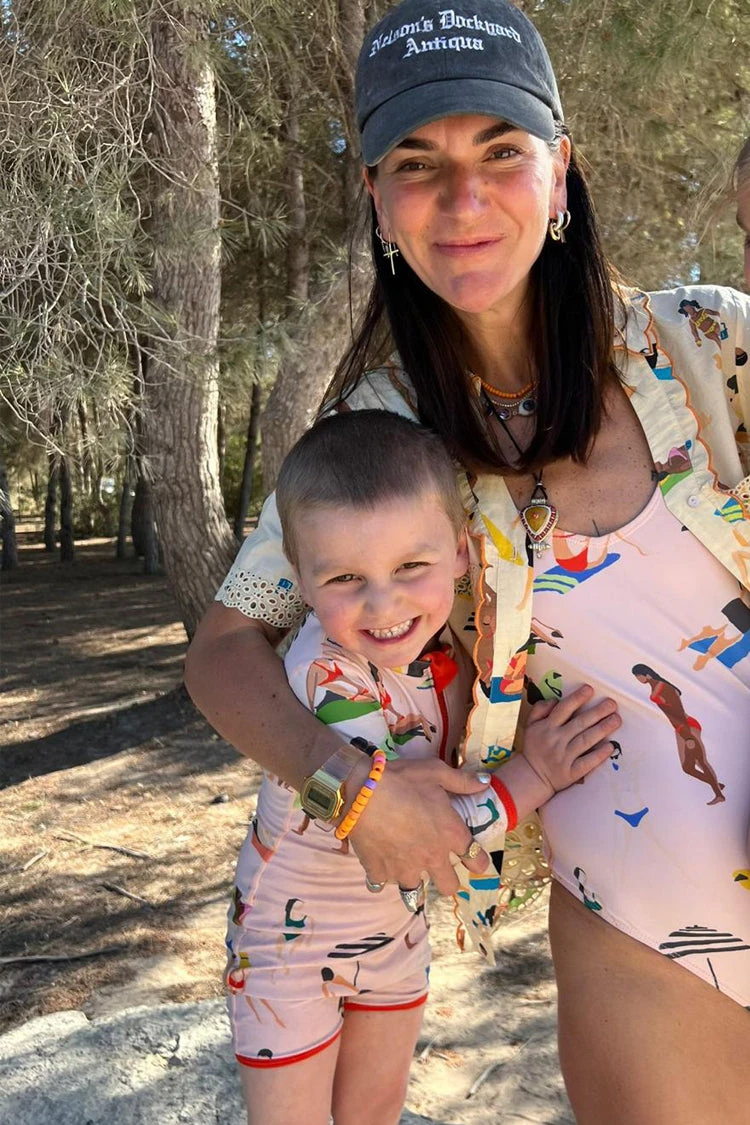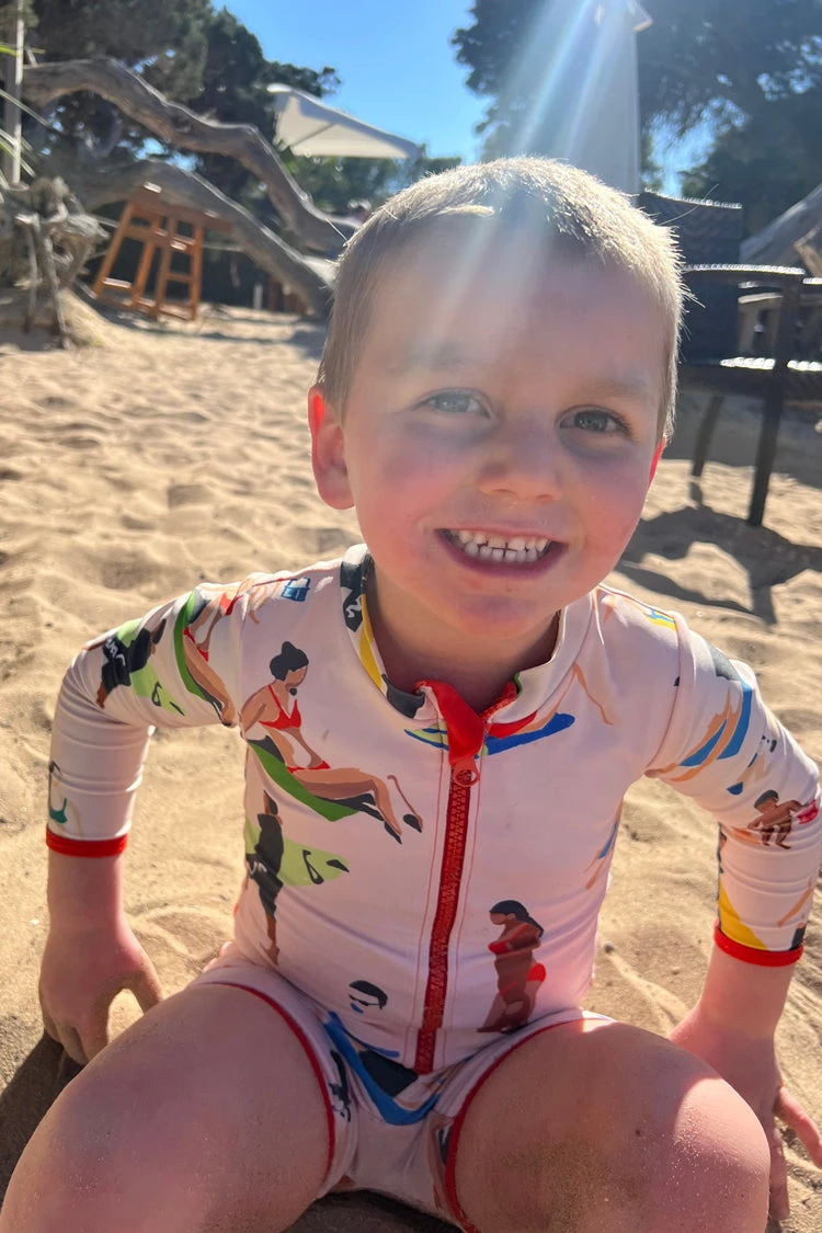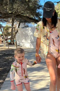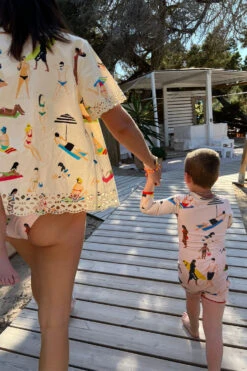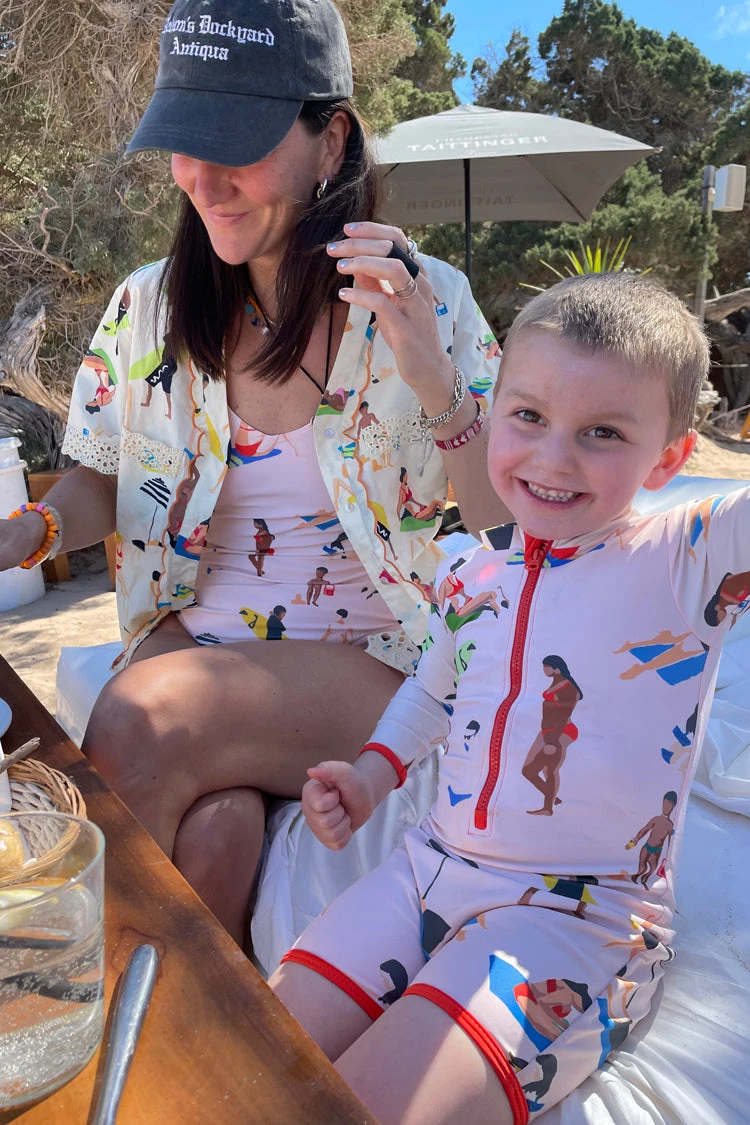 Resort ready matching family swimwear for Ibiza poolsides or boat rides in Santorini. A retro inspired print featuring little sunbathing motifs on a cream base with an orange waist tie. Print also available in women’s and kids swim, and a co-ord.