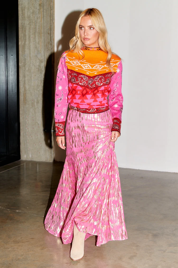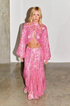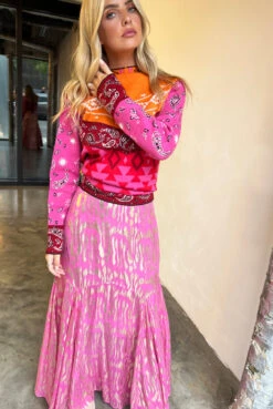 A delightful pink jacquard fabric with gold flecks, it’s perfect for adding a touch of glamour to your outfit. Boasting a floaty hemline, you’ll be the best dressed guest no matter the occasion. We love this in the office with a plain tee and sandals or with the matching top and heels for the bar.