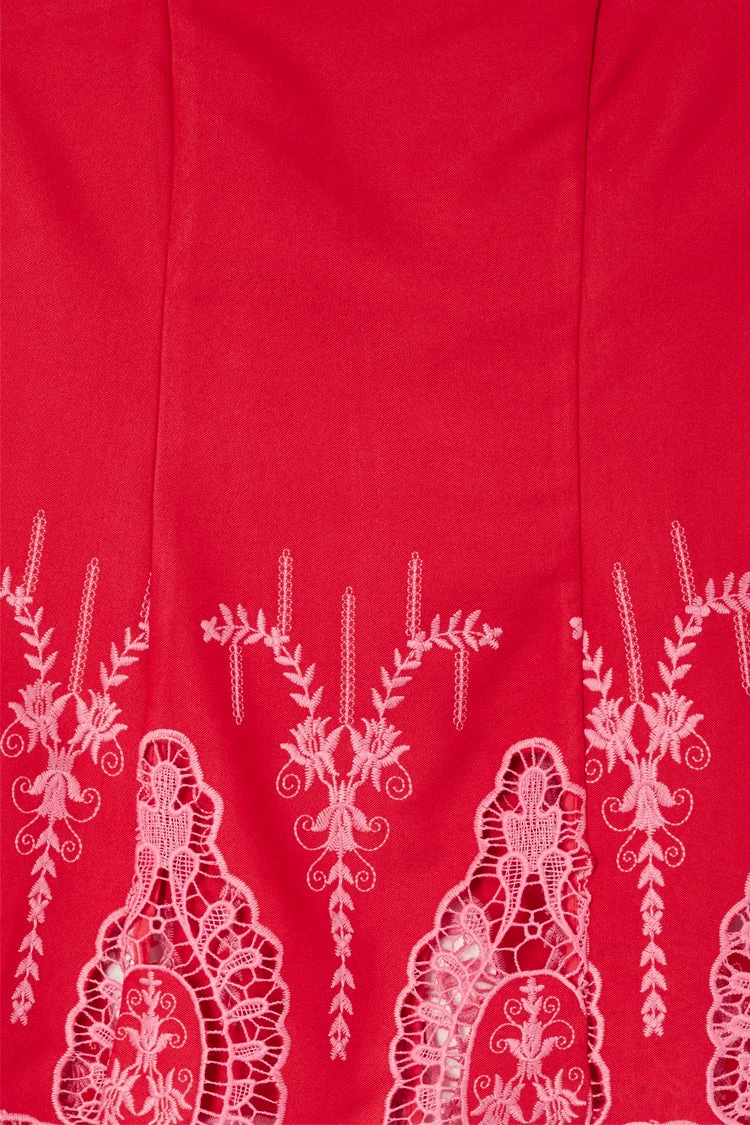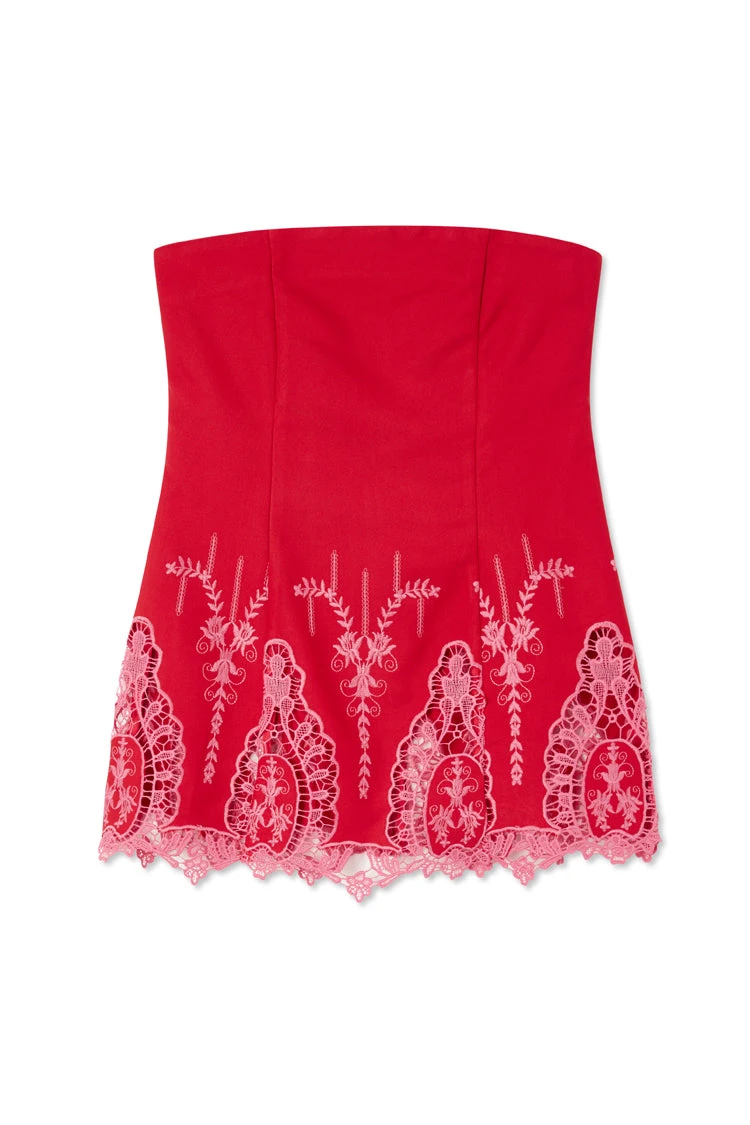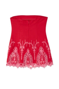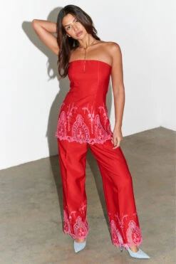 A red bandeau top, trimmed with broderie lace that feels super floral and feminine. The rose pink and red hues create a colour clash that we love, and coordinates with the rest of the suit. Pair it with the matching trousers, or with a wide leg jean for such a uniquely refined look. It’s a really flattering length, longer than a t-shirt, but skims the figure with subtle boning.