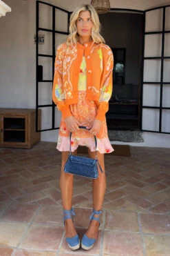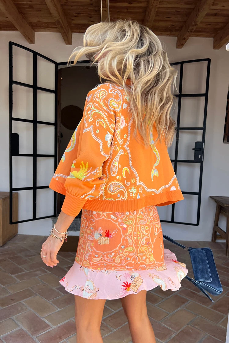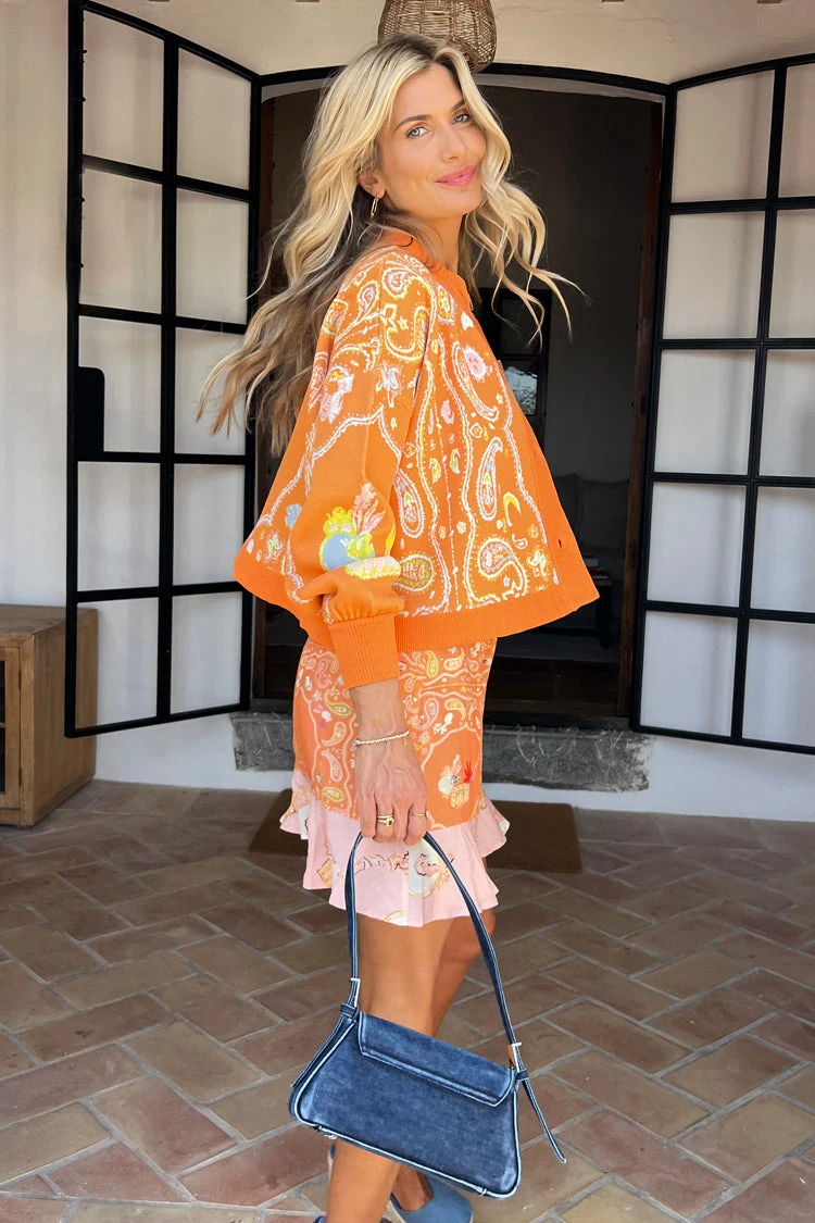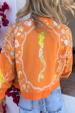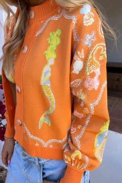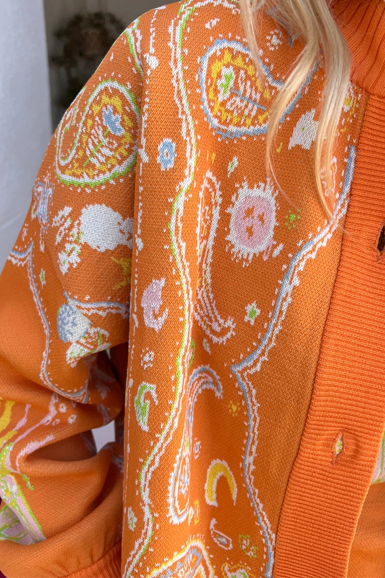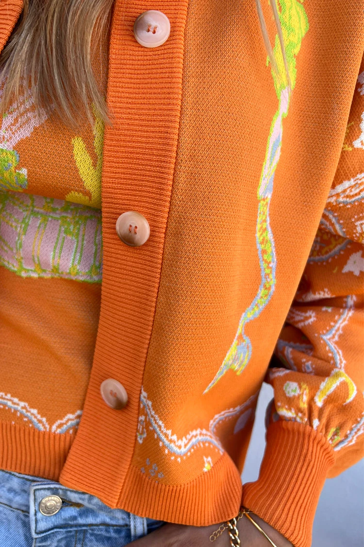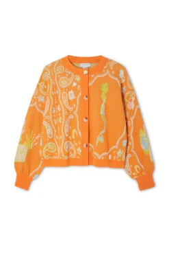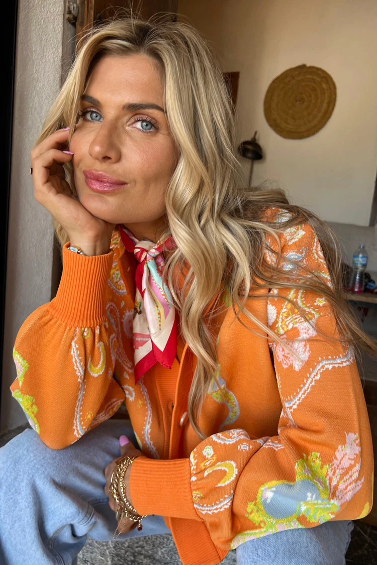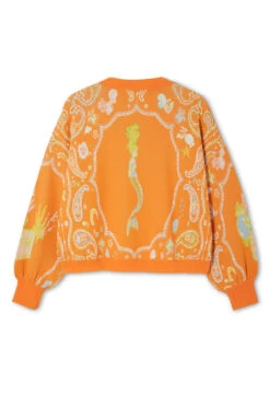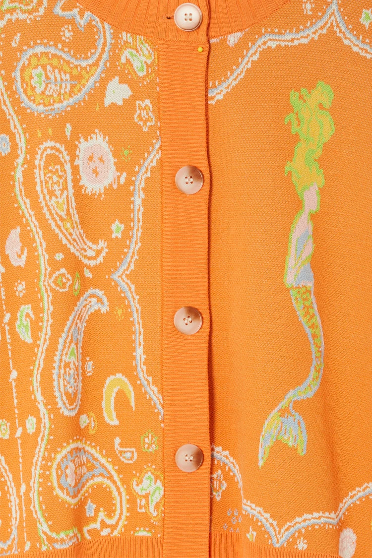 Joyful orange hues and a beautifully unique jacquard design, inspired by life under the sea. With hints to our classic bandana detailing and our beloved soft stretch knitwear, this cardi is SO NFD.