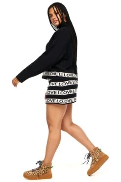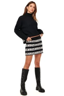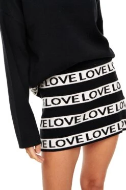 A sleek mini made from a soft and stretchy knit, printed with white stripes with “Love” motifs. With a ribbed waistband for a comfortable and flattering fit, and a sophisticated monochrome colour palette. Wear with the matching Love jumper, or your favourite black top (you know the one). Wear with bare legs and trainers or layer with tights and boots.