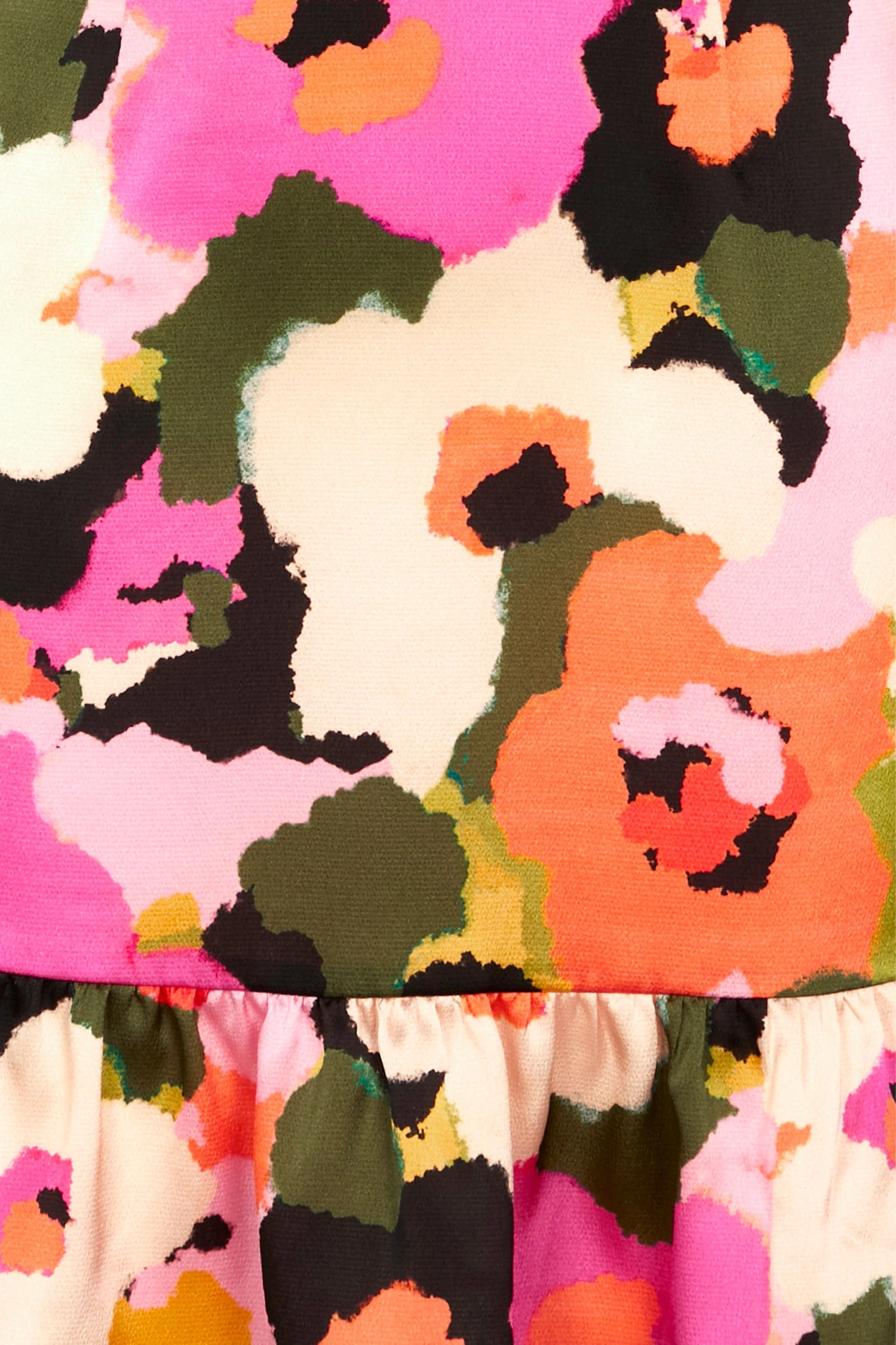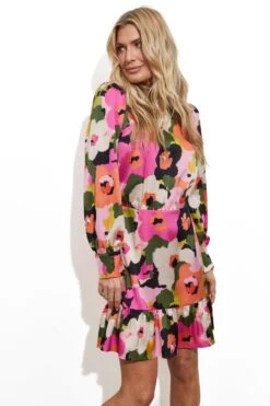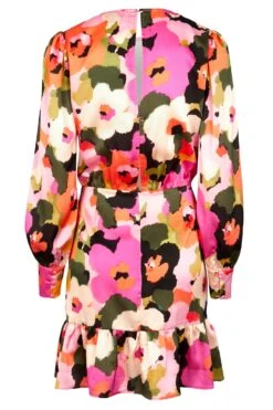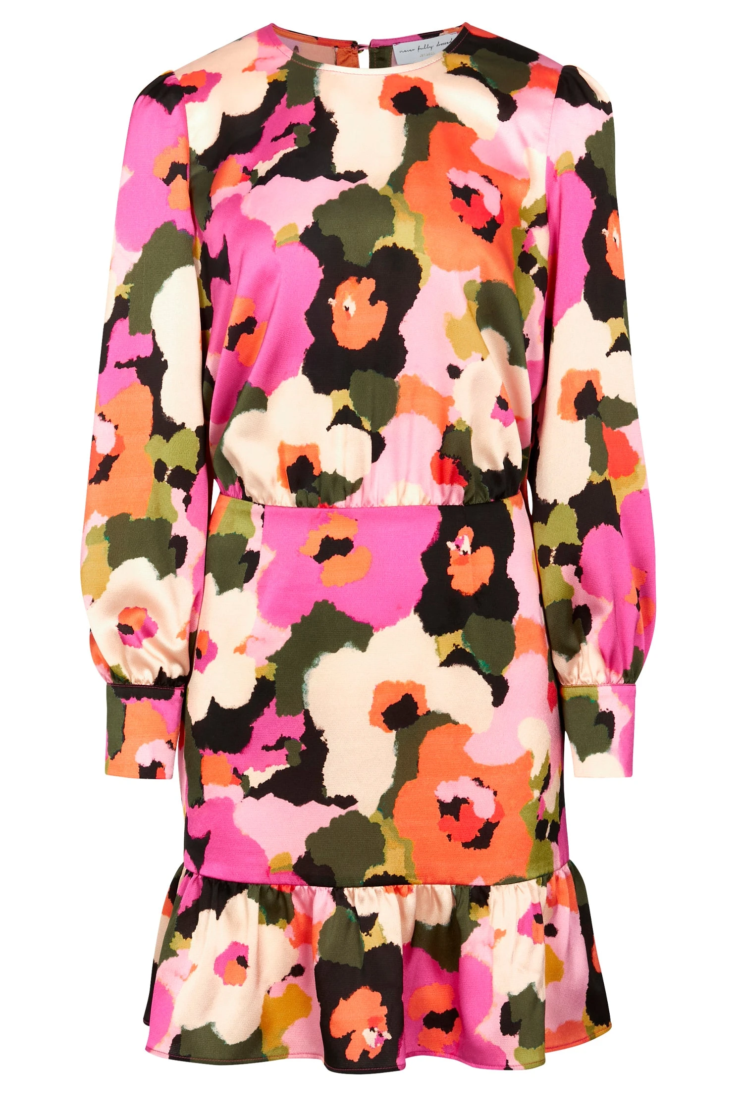 An abstract print stamped with vibrant florals. A fitted silhouette from the waist to a frilled hem, with a looser fitting bodice and long blouson sleeves. Match your accessories to one of it’s bold shades.